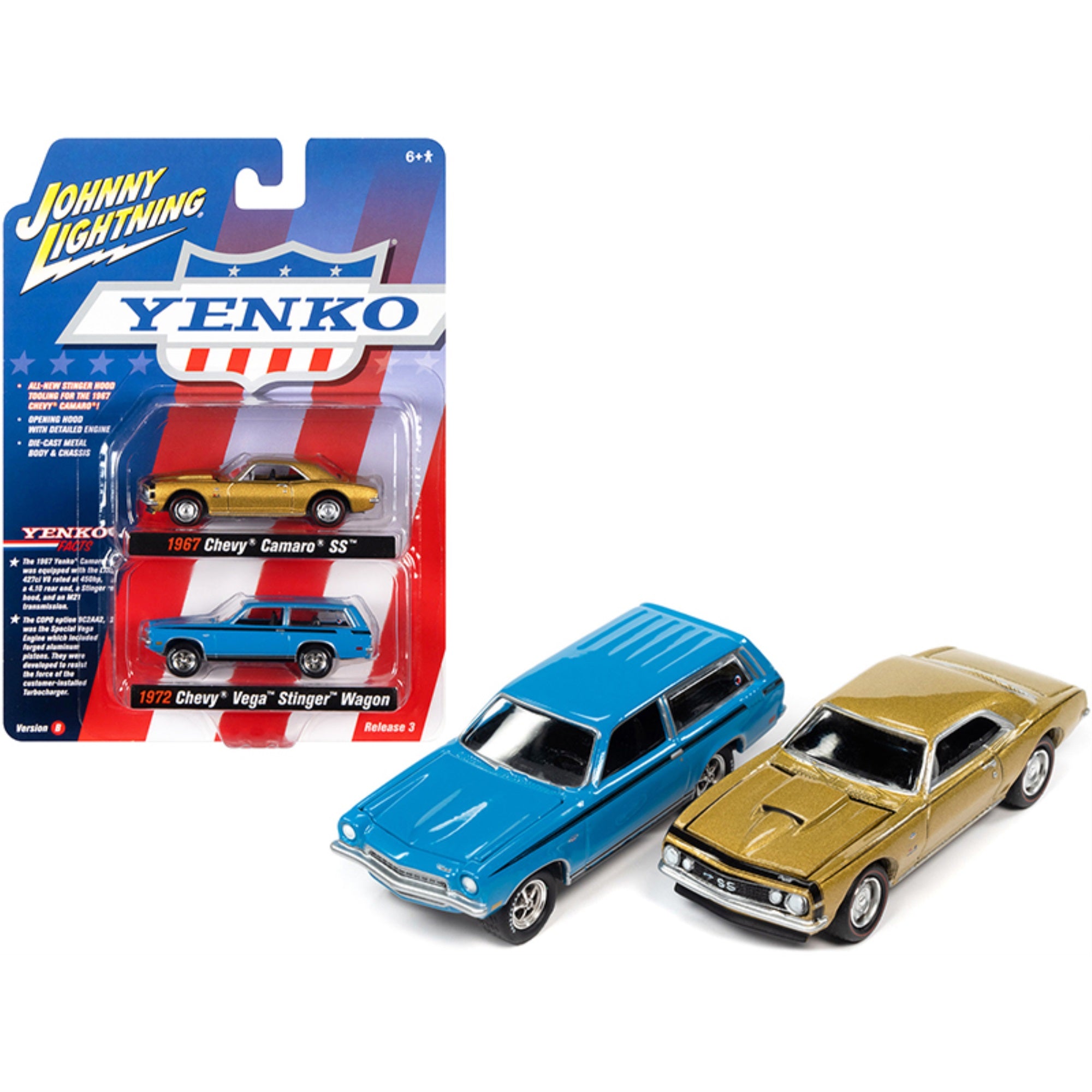 1967 Chevrolet Camaro Ss Gold Metallic And 1972 Chevrolet Vega Stinger Wagon Blue 'Yenko' Set Of 2 Cars 1/64 Diecast Model Cars By Johnny Lightning