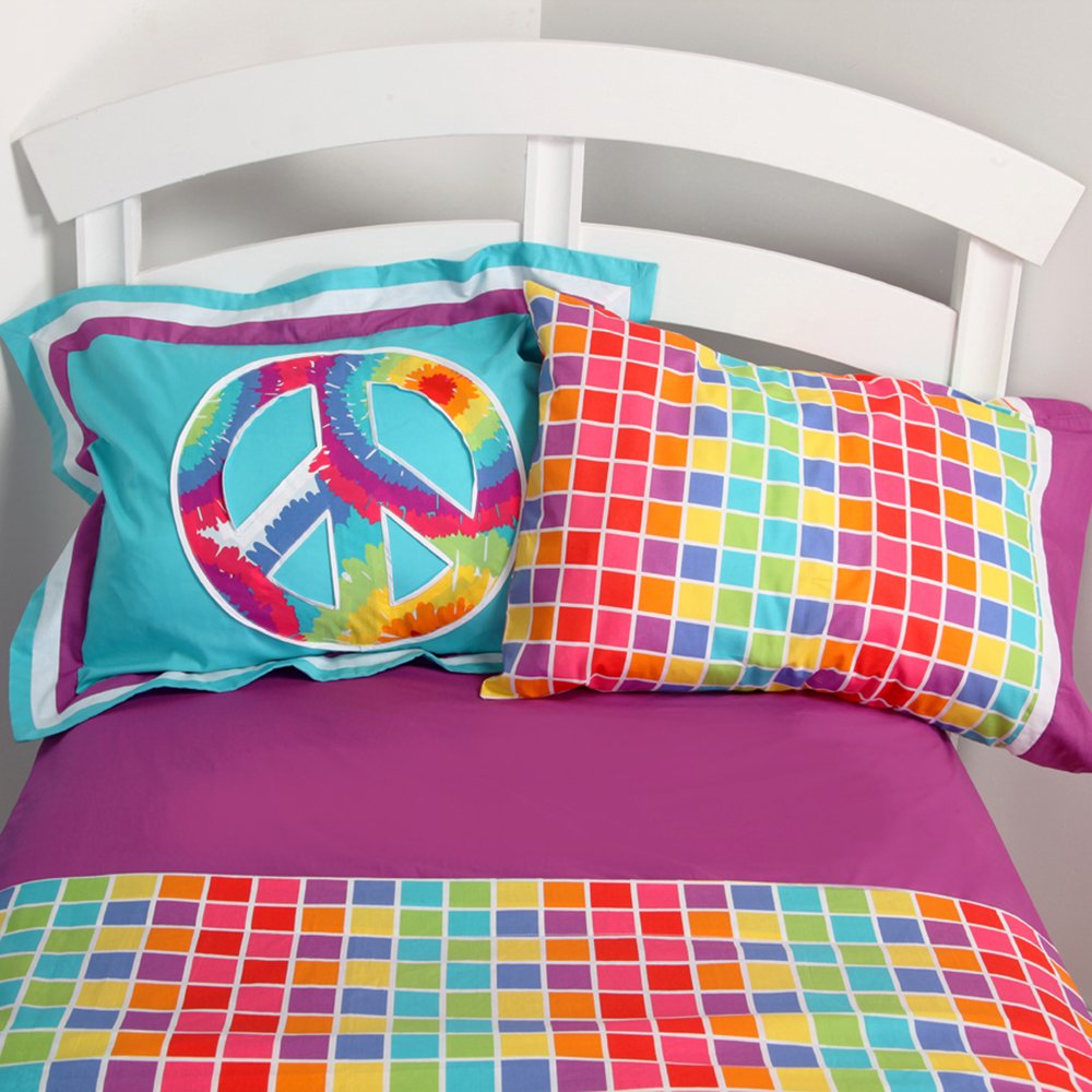 Don'T Forget This Collections Must Have Sheet Set Which Includes (1) Flat, (1) Fitted Sheet And (2) Standard Pillowcase. Fitted Sheet Designed In Solid Purple As Seen Throughout Entire Collection. Flat Sheet Is Designed Using Tie Dye Rows. Both In Cotton Print Fabric. Standard Pillowcase Is Designed In Tie Dye Rows With Hem And Trim In White And Purple Cotton Print Fabric.