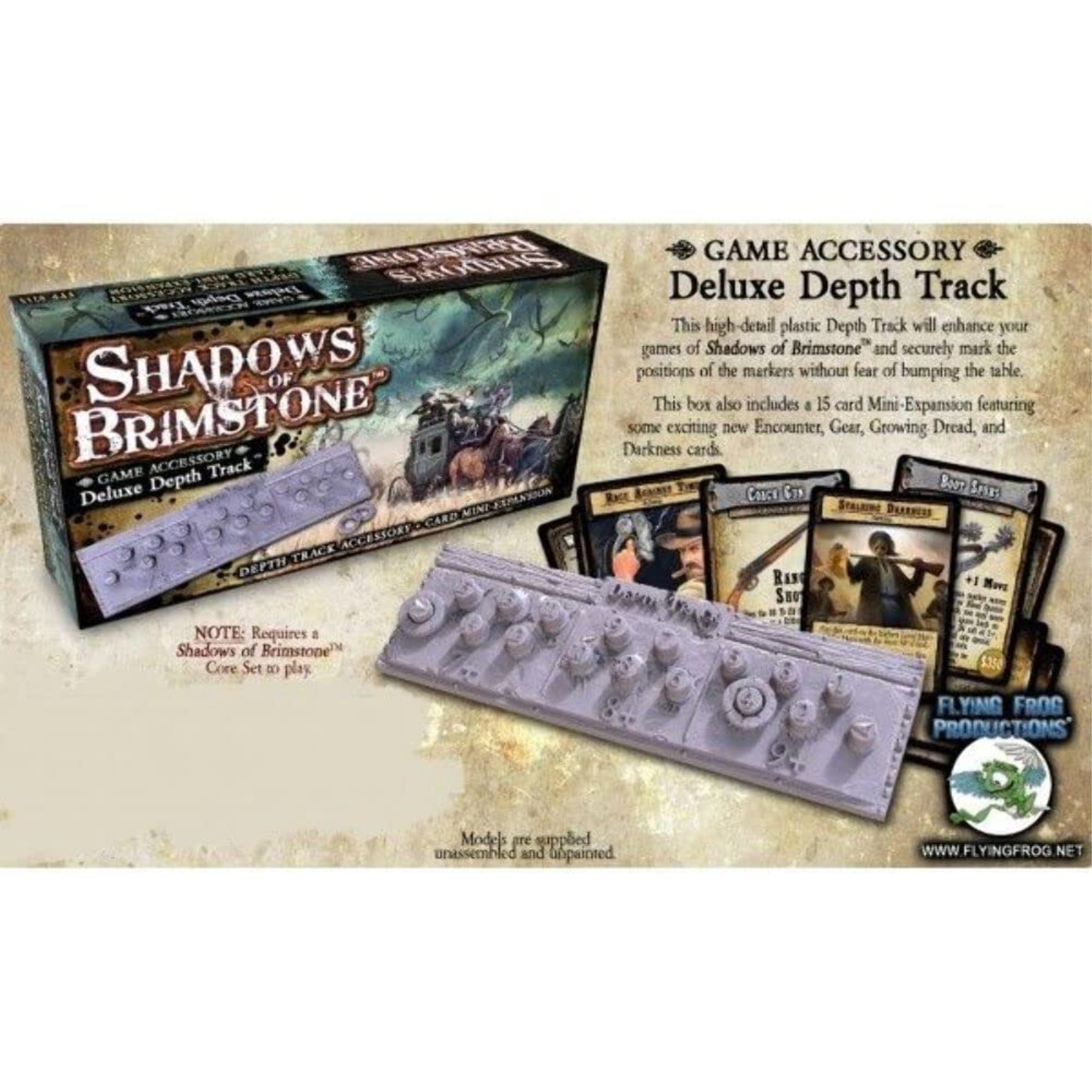 The Deluxe Depth Track Expansion Is A Great Way To Add A Bit Of Extra Flair And Theme To Your Shadows Of Brimstone Adventures! This Set Includes 1 Large High-Detail Plastic Depth Track For Use While Adventuring Down In The Dusty Mines Of The Old West, As Well As 1 Textured Plastic Hero Posse Marker Ring And 1 Textured Plastic Darkness Marker Ring. This Set Also Includes 15 New Cards For The Game (4 Gear, 3 Mine Encounters, 4 Darkness, And 4 Growing Dread). They Are Themed For Racing Against Time To Hold The Darkness At Bay!