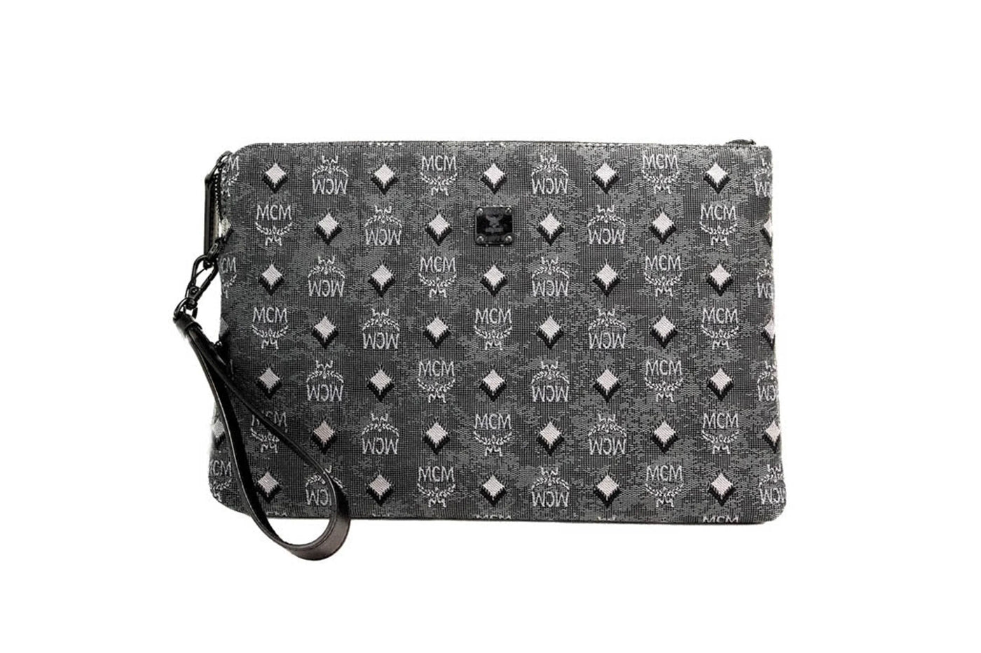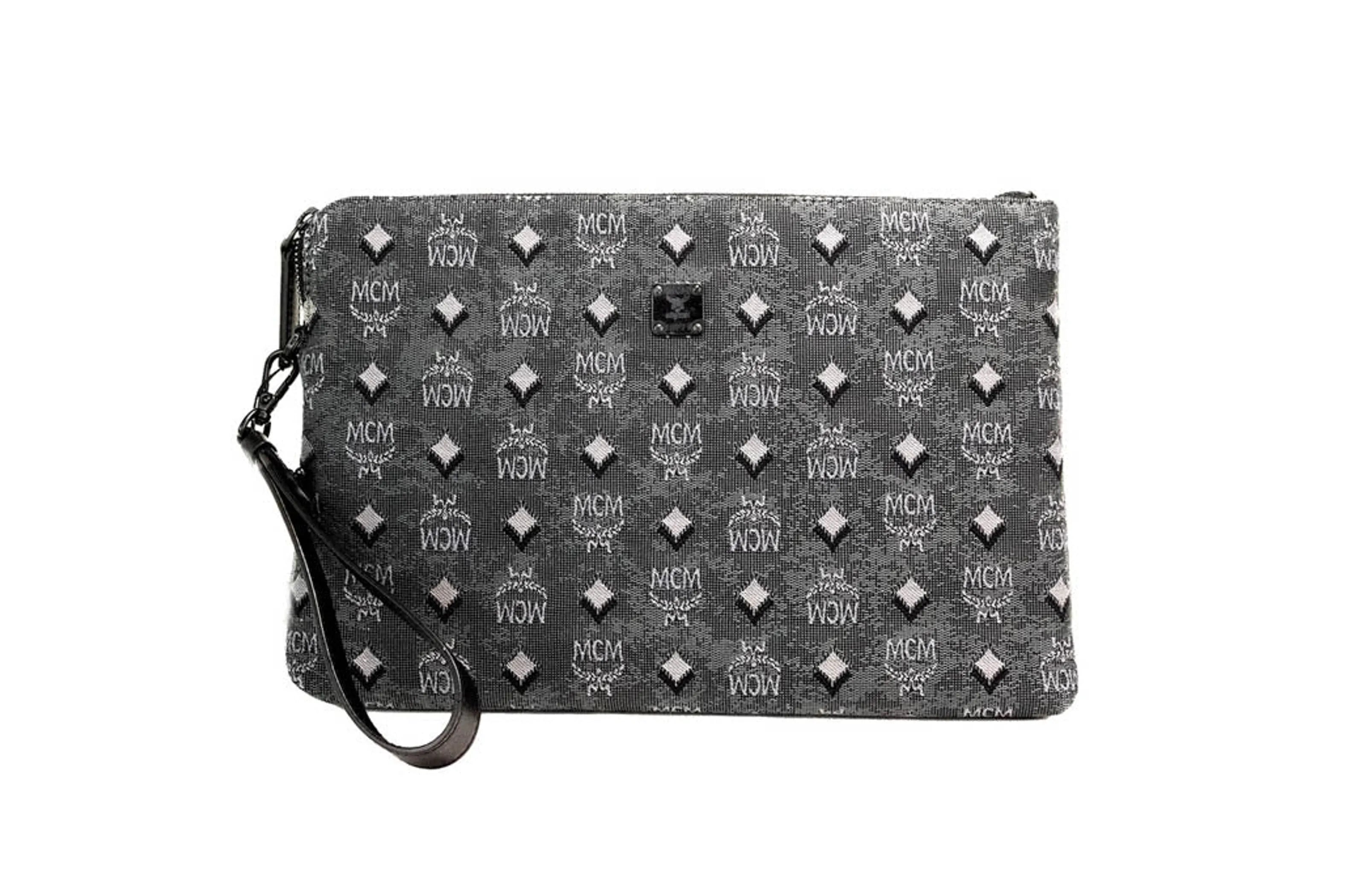Style: Mcm Veritas Medium Denim Monogram Logo Canvas Clutch Pouch Handbag (Dark Grey)