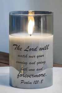 Flameless Pearlized Grey Led Glass Candle That Says: The Lord Will Watch Over Your Coming And Going Both Now And Forevermore.