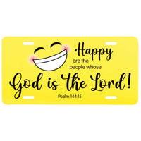Beautiful D?Corative Auto Plate Features A Smiley-Face On A Yellow Background With Psalm 144:15 Happy Are The People Whose God Is The Lord! Art Is Sublimated Into The Aluminum For Permanent Durability. Size Of Plate Is 12 X 6.