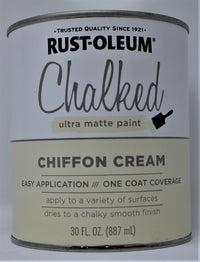 Rust-Oleum Chalked Ultra Matte Paint Is A Fast Drying Latex Paint That Allows You To Transform Interior Furniture With Little To No Prep Or Priming. Low Odorvoc Formula Promotes Easy Application And Dries To A Smooth Chalky Finish. Bring A Soft Trendy Coating To Your Surfaces That Cleans With Soap And Water. Brand Name: Rust-Oleum Sub Brand: Chalked Sheen: Ultra Matte Color: Chiffon Cream Base Type: Water-Based Product Type: Chalk Paint Container Size: 30 Oz Coverage Area: 150 Sq Ft Voc Level: 75 Gl Recommended Surface: Apply On Indoor Wood, Metal, Ceramic, Glass And Canvas Full Cure Time: 30 Min Time Before Recoating: 4 Hr Clean Up: Soap And Water Indoor Or Outdoor: Indoor Color Family: White