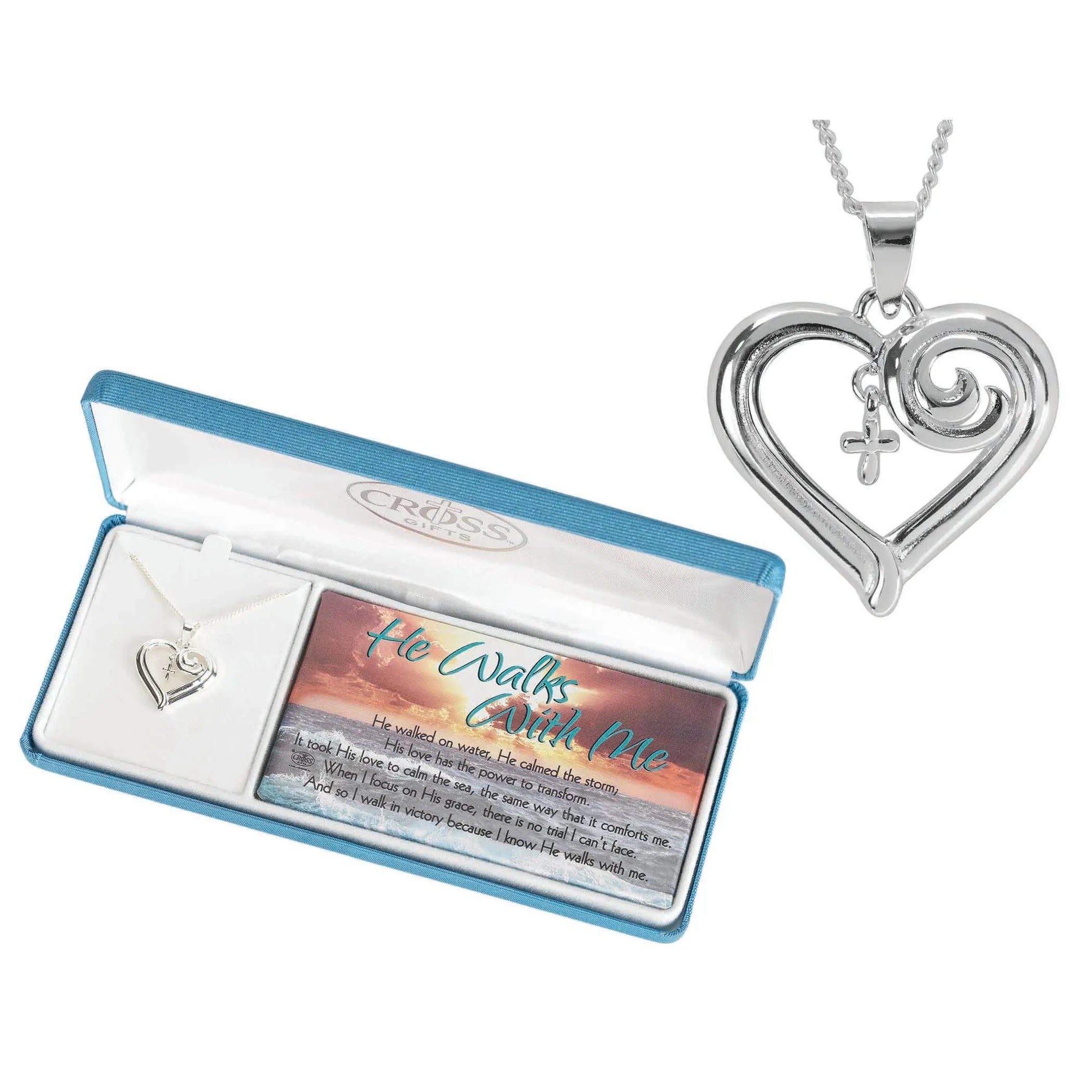 He Walks With Me Wave Heart Necklace In Deluxe Gift Box With Verse Stylish Open Heart Necklace Features A Wave Design; From It Dangles A Petite Rounded Cross.