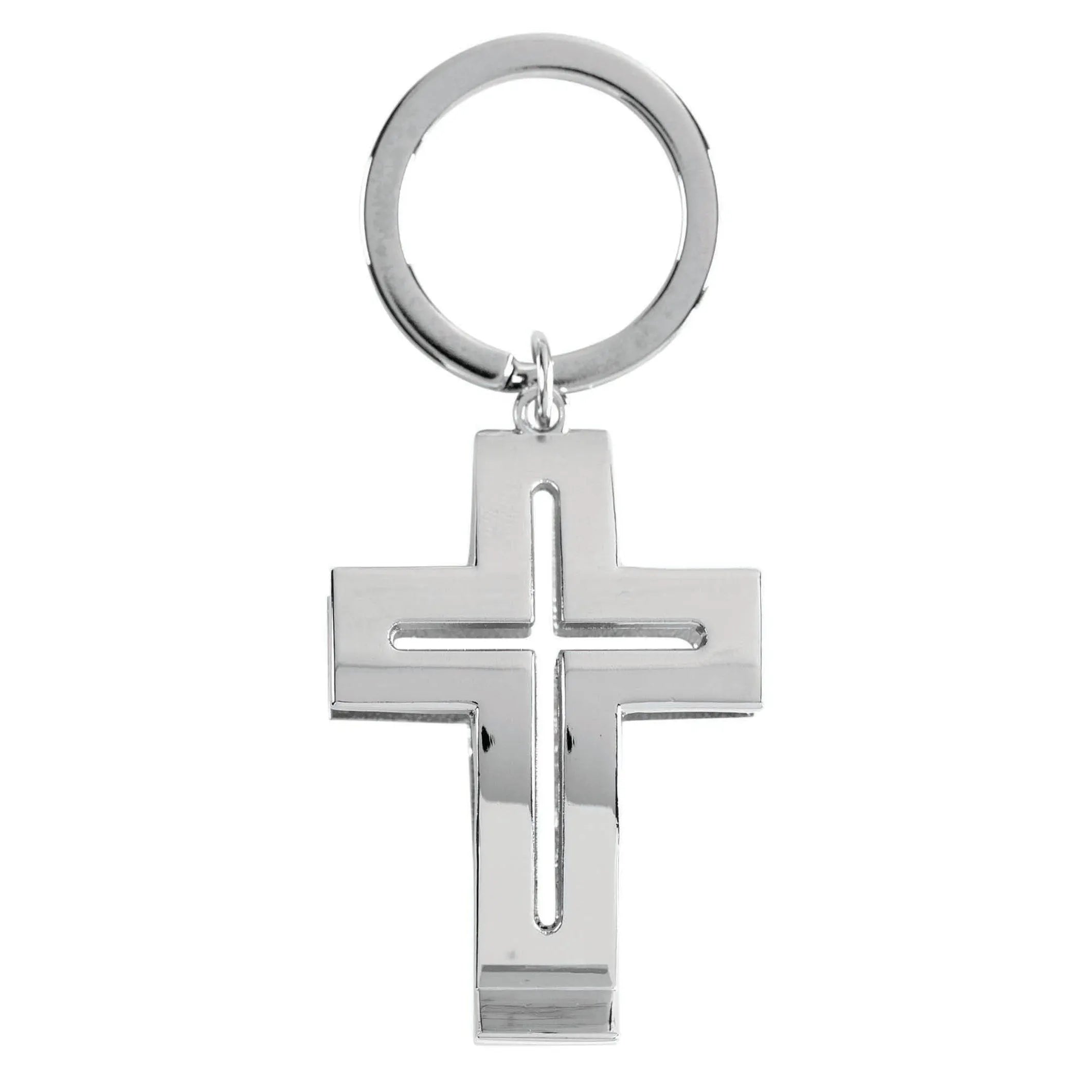 Cross And Keyring Are Gleaming Silver Polished Metal.