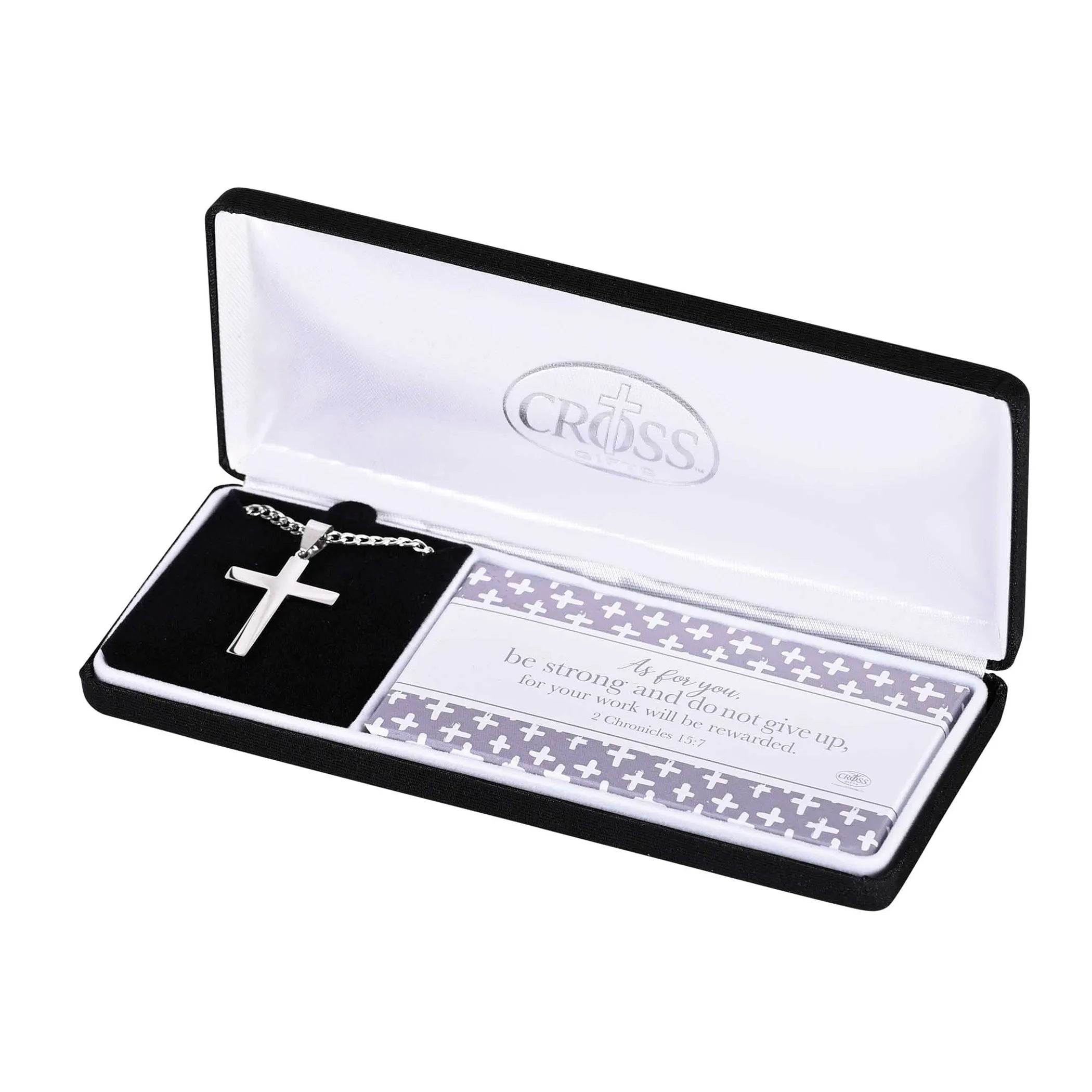 Mens Stainless Steel Box Cross Necklace Measures 1 1/2 Inch And Has A V-Bale And Hangs From A 24In Chain. Comes In A Black Hinged Box With 2 Chronicles 15:7 Insert That Reads: As For You, Be Strong And Dont Give Up, For Your Work Will Be Rewarded.