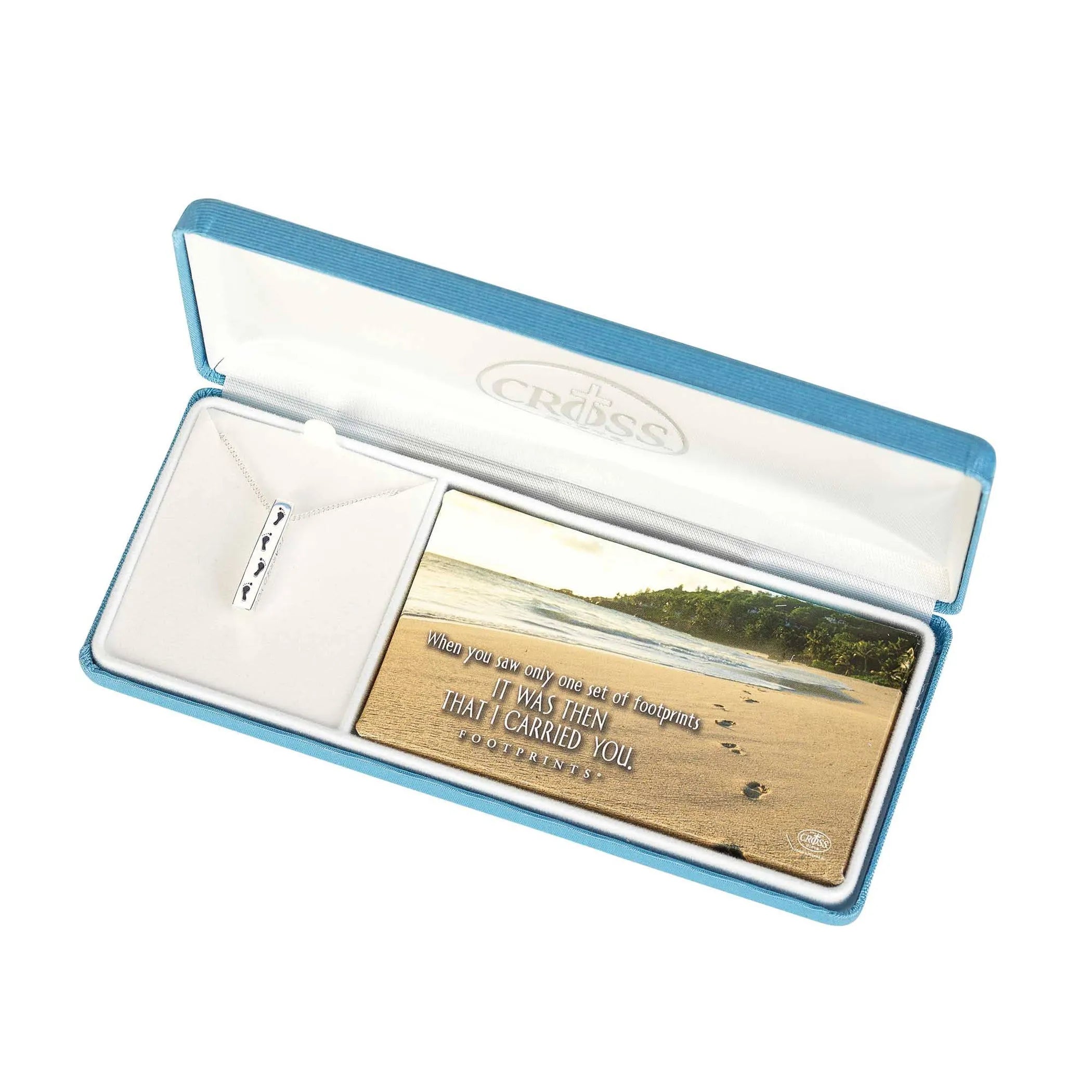 Necklace Comes In A Bright Sea Blue Fabric Covered Gift Box With Seashore Scene And The Last Lines Of The Footprints Verse Inside.