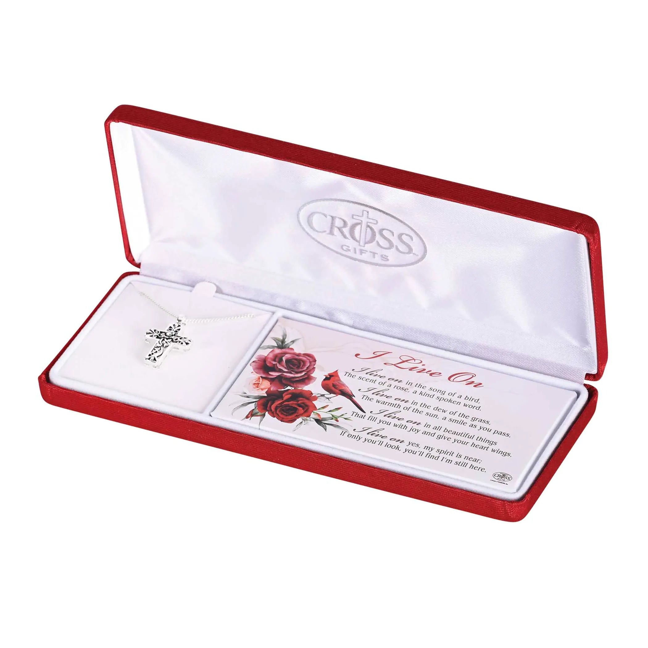 I Live On Floral Cross With 3Cz Is Silver Plated And Hangs On An 18 Inch Chain. Packed In A Crimson Hinged Gift Box With Insert That Reads: I Live On In The Song Of A Bird, The Scent Of A Rose, A Kind Spoken Word. I Live On In The Dew Of The Grass, The Warmth Of The Sun, A Smile As You Pass. I Live On In All Beautiful Things That Fill You With Joy And Give Your Heart Wings. I Live On; Yes, My Spirit Is Near; If Only You Will Look, You Will Find I Am Still Here. Verse By B. Stuckwisch Copyright Dicksons.