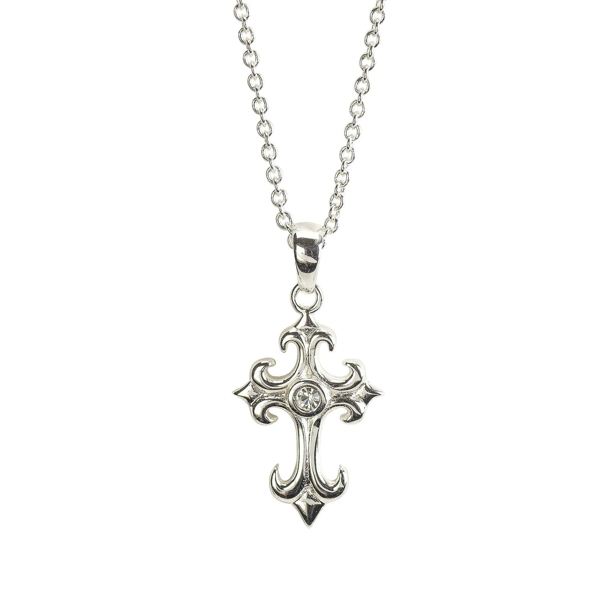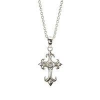 Silver Plated Fancy Bud Cross Necklace Has Clear Crystal At Center; Cross Is 3/4'L.