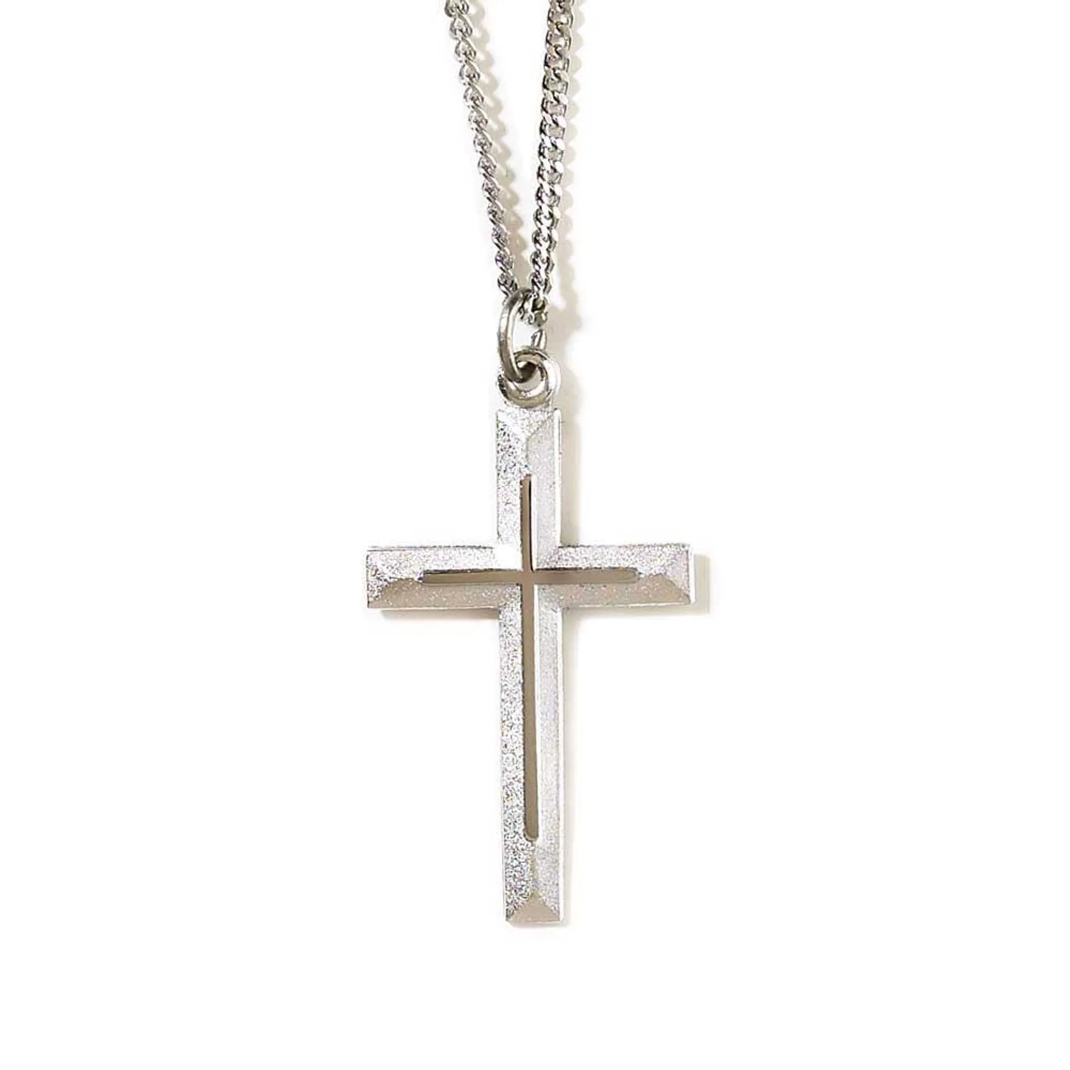 A Thin Silver Cross Tops A Beveled Cross For A Distinctive Look.