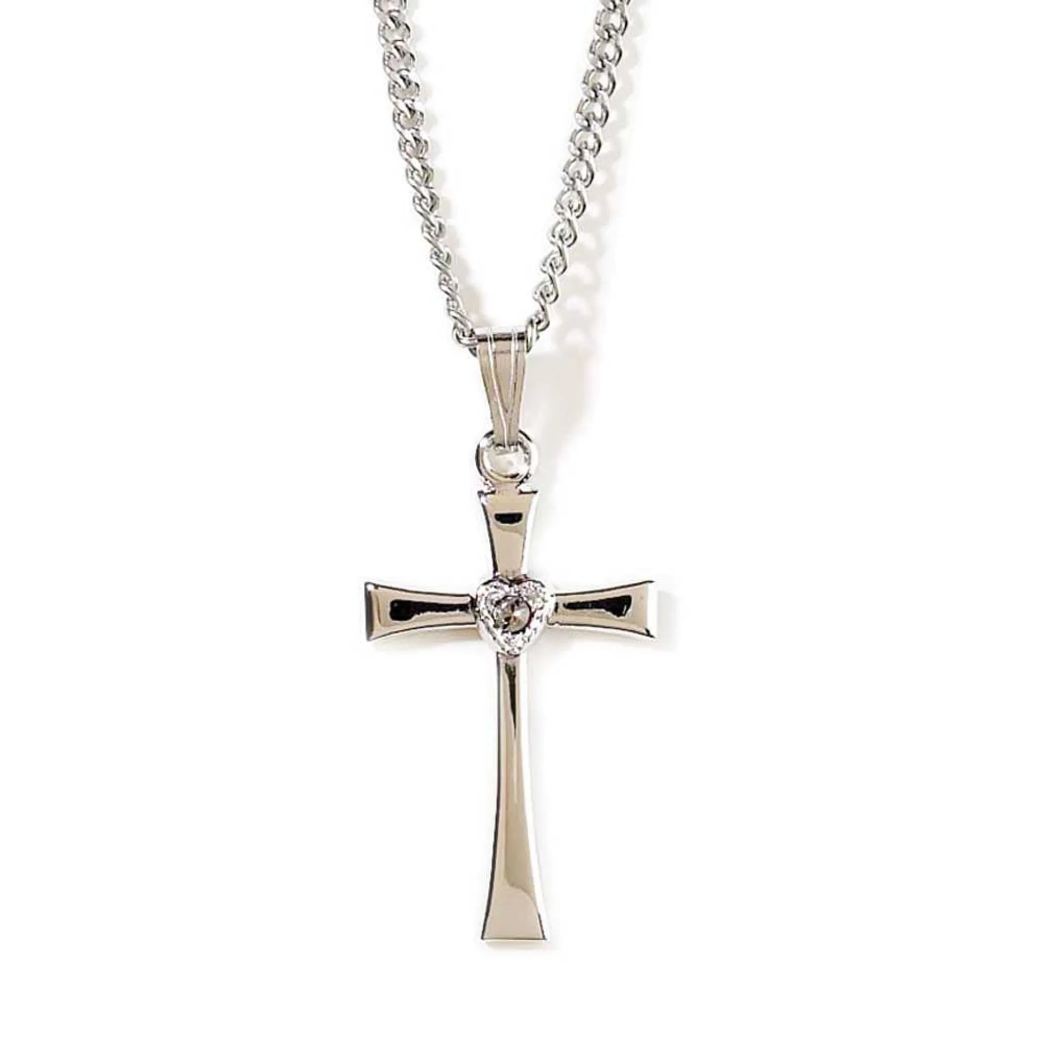 Silver Plated Flared Cross With Cz Heart On An 18 Inch Chain