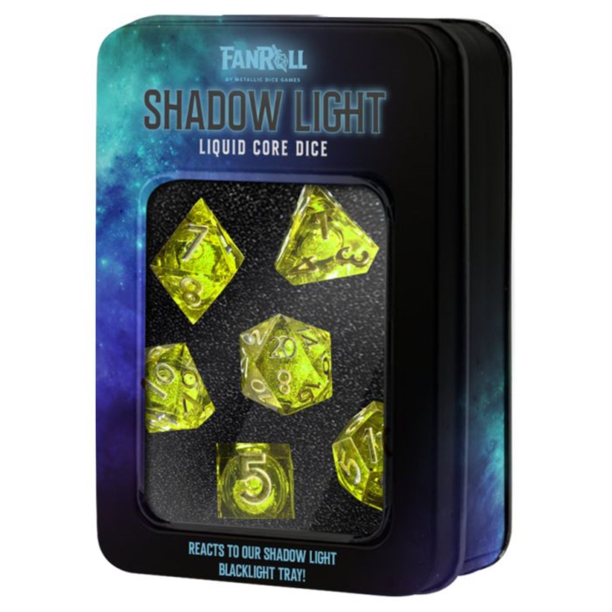 New Shadow Light Liquid Core Dice Were Developed Especially For Maximum Black Light Reaction With Our Shadow Light Dice Tray. These Dice Have A Fun Snowglobe Effect On The Table And Then When The Black Light Hits They Glow An Incredible Bright Neon Green Color That Is Sure To Kick Any Game To The Next Level. Gamers Love Black Lights And Fanroll Is Thrilled To Introduce The Newest Innovation In Black Light Technology.