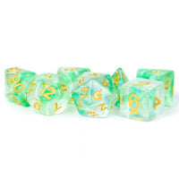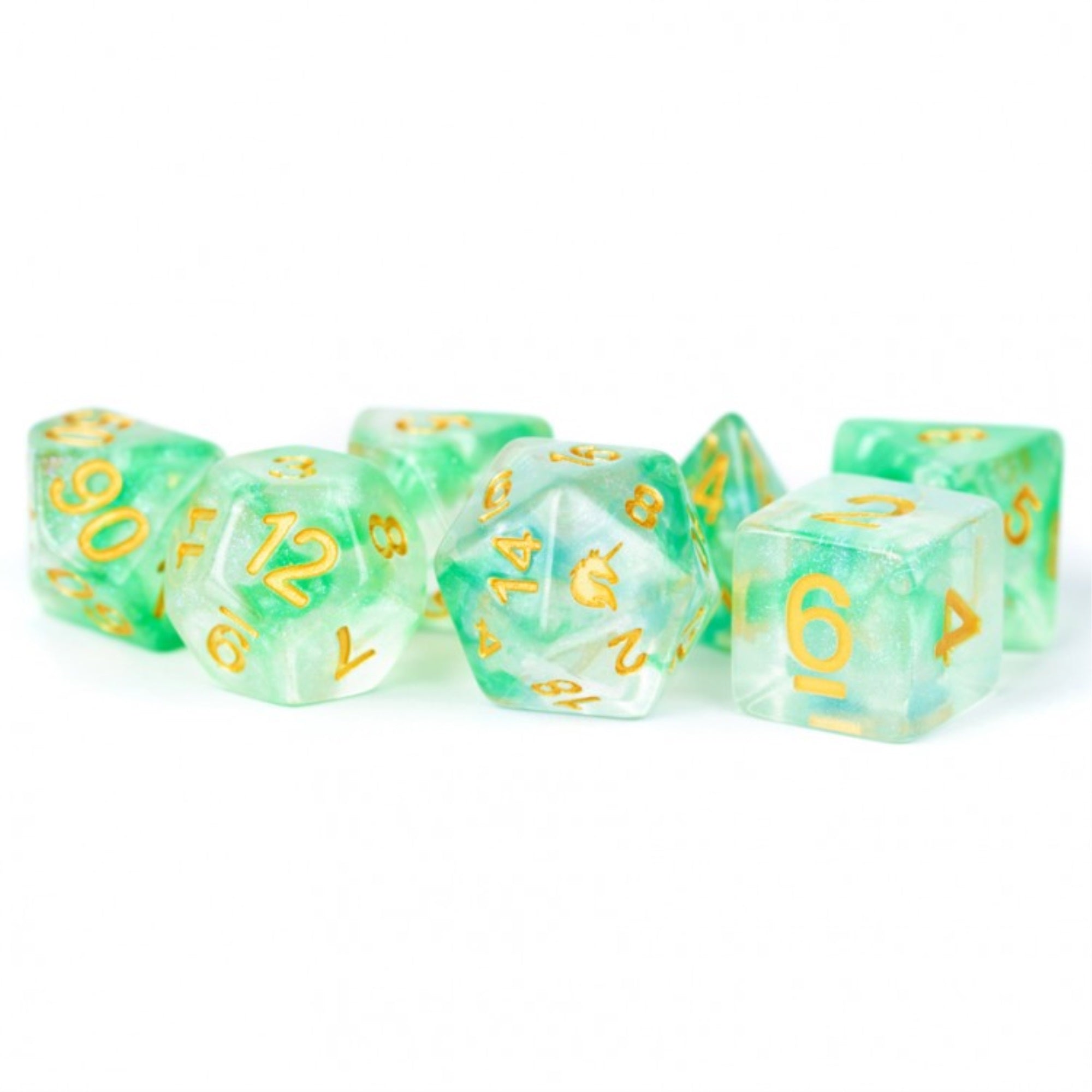 Set Of Seven Unicorn Dice In Icy Everglades Transparent Resin.