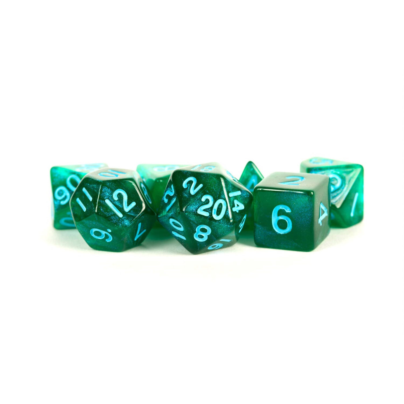 Met178 Green Stardust Resin Dice With Blue Numbers 16Mm (5/8In) 7-Dice Set Metallic Dice Games