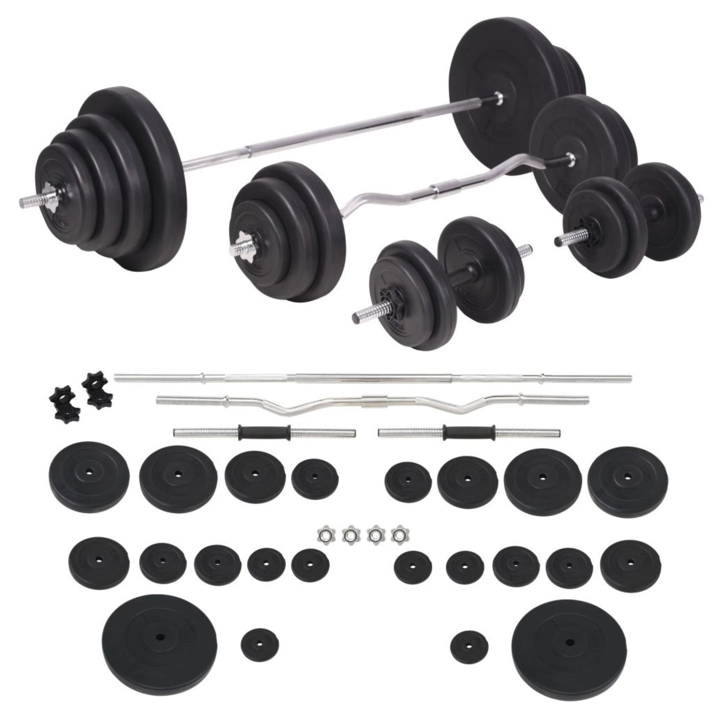 This Versatile Barbell And Dumbbell Set Is Perfect For Chest, Biceps, Arms, Triceps And Back Muscles. It Includes Two 15 Kg Plates, Two 10 Kg Plates, Two 7.5 Kg Plates, Four 5 Kg Plates, Six 2.5 Kg Plates, Six 1.25 Kg Plates, Two Barbell Bar And Two Dumbbell Bar And Has A Total Weight Of About 120 Kg. This Set Allows The Users To Variably Select The Weights They Want To Lift For Different Exercises. These Plates Are Made Of Cement With A Plastic Shell And They Can Easily Be Secured Onto The Bars With The Included Star Locks. The Weight Is Clearly Stamped On Each Plate For Quick And Easy Identification.