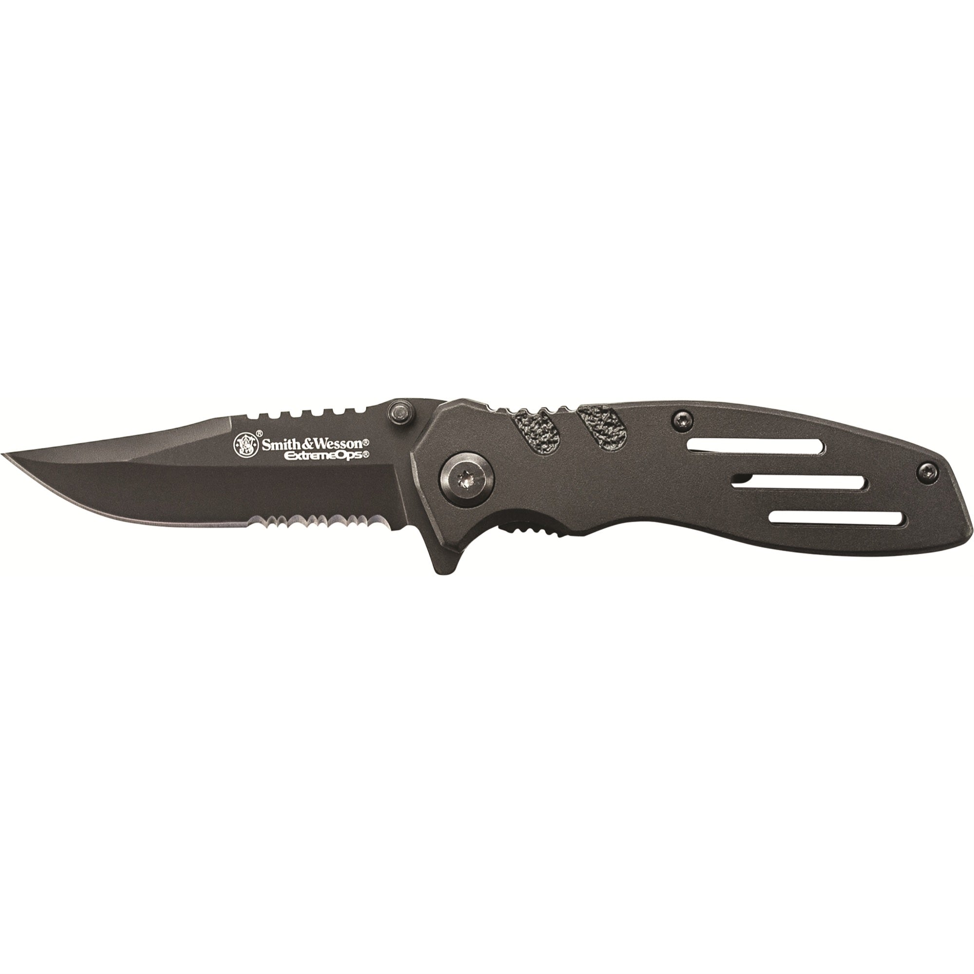 Swa24S - Smith &Amp; Wesson Extreme Ops Liner Lock Black Clip Point Blade W/Ambidextrous Thumb Knobs Black Aluminum Handle