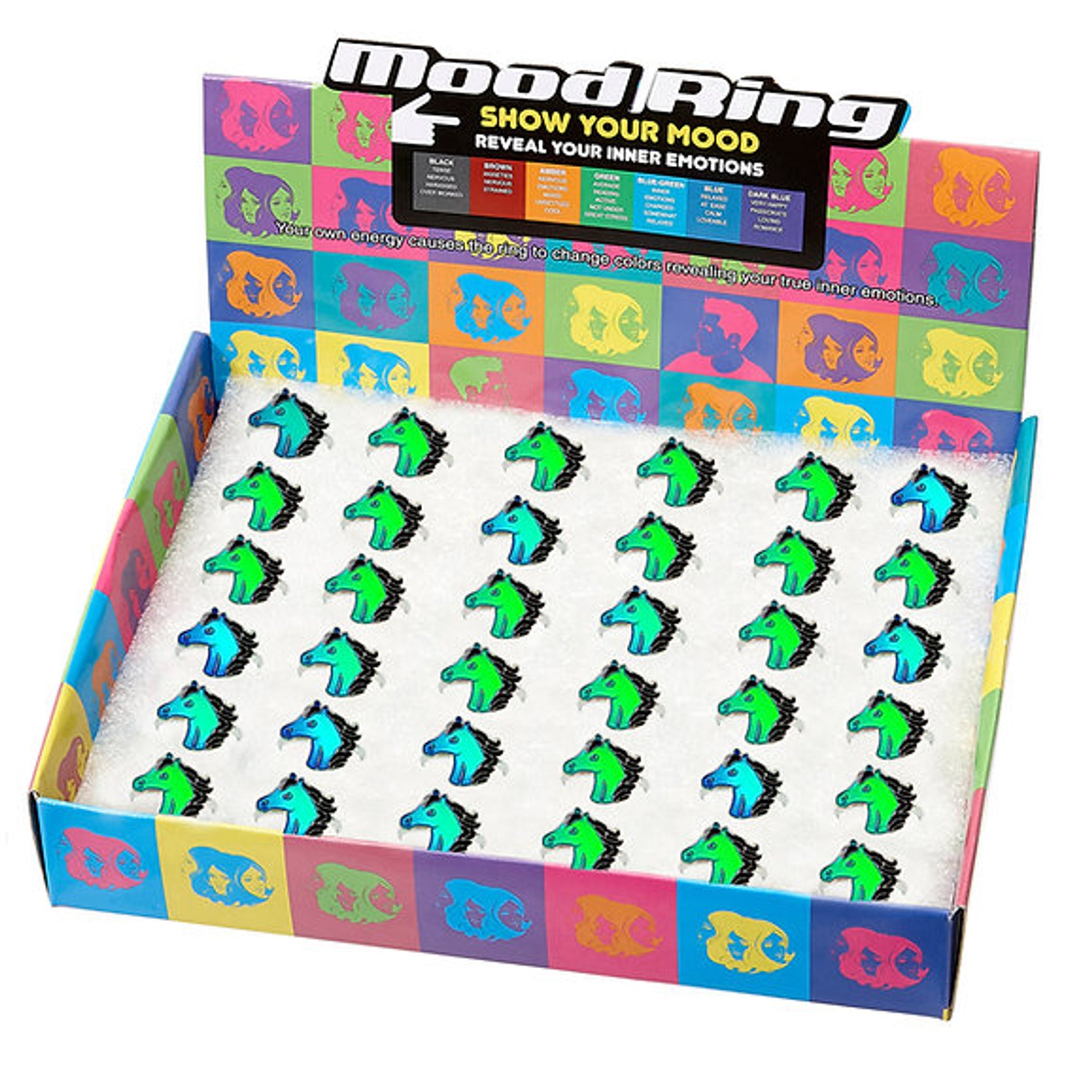 Display Box Of 36 Horse Head Rings. Display Of 36. One Size Adjustable.