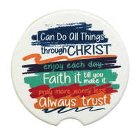 These Car Coasters Add An Inspirational And D?Corative Touch To Your Auto Cupholders. Features Several Faith Phrases In A Colorful Design. The Coasters Are Practical, Too: The Sandstone Ceramic Absorbs Moisture, And Include A Finger Notch For Easy Removal From Cupholder. Diameter Is 2 5/8In; Thickness Is About .25In. Sold As A Set Of Two In Carded Header Bag.