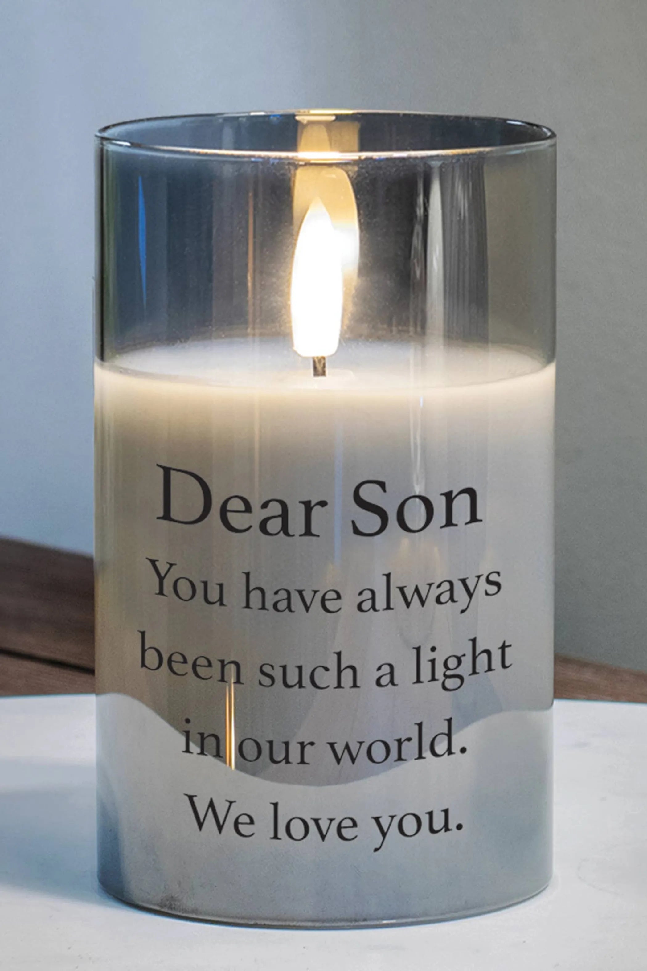 Flameless Pearlized Grey Led Glass Candle That Says: Dear Son, You Have Always Been Such A Light In Our World.