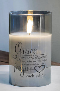 Flameless Pearlized Grey Led Glass Candle That Says: Grace: Generosity Of Spirit; A Capacity To Tolerate, Accommodate Or Forgive Each Other.