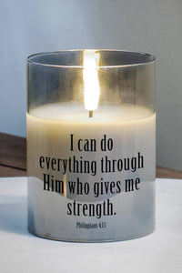 Flameless Pearlized Grey Led Glass Candle That Says: I Can Do Everything Through Him Who Gives Me Strength.