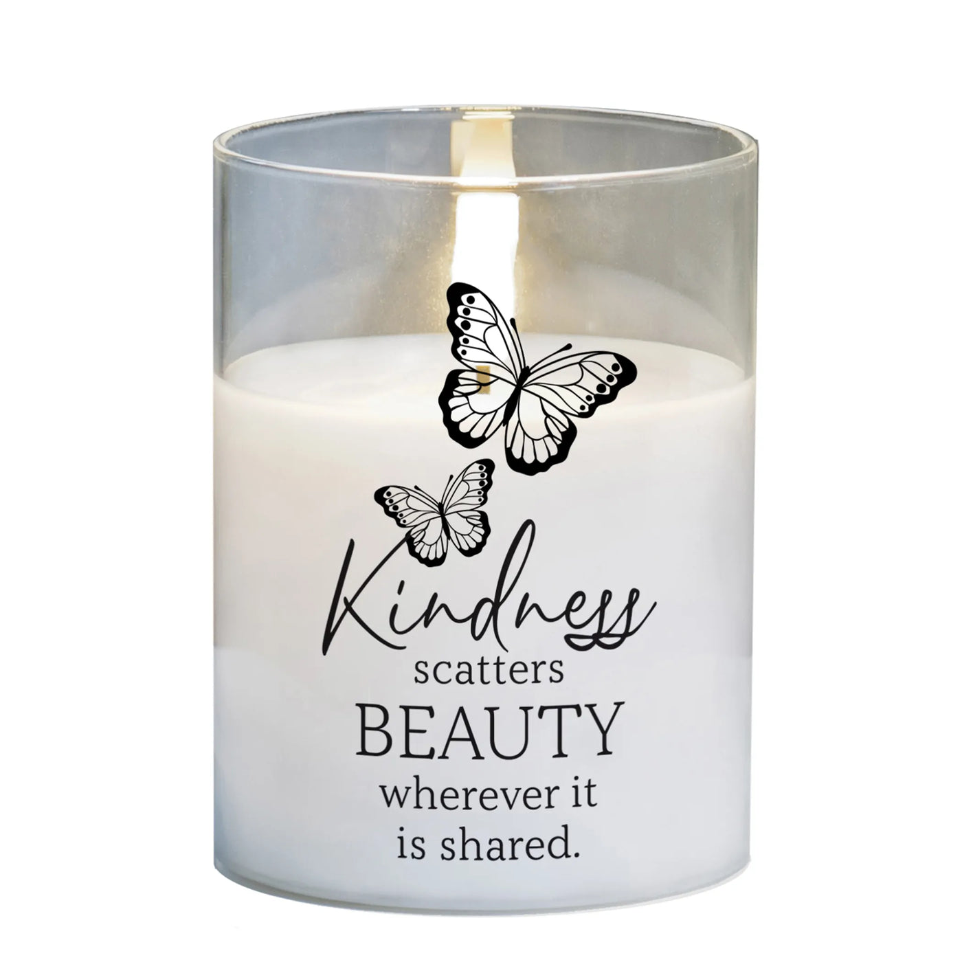 Flameless Clear Led Glass Candle That Features Text: Kindness Scatters Beauty Wherever It Is Shared. 4In Tall Led Candle Has A Flickering Flame Appearance; 3In Diameter. Takes Three Aaa Batteries, Not Included.