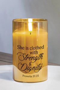 Flameless Pearlized Gold Led Glass Candle That Says: She Is Clothed With Strength & Dignity.