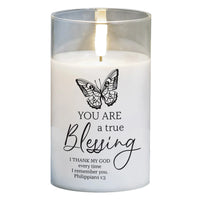Flameless Clear Led Glass Candle That Features Text And Scripture: You Are A True Blessing; Philippians 1:3: I Thank My God Every Time I Remember You. 5In Tall Led Candle Has A Flickering Flame Appearance; 3In Diameter. Takes Three Aaa Batteries, Not Included.