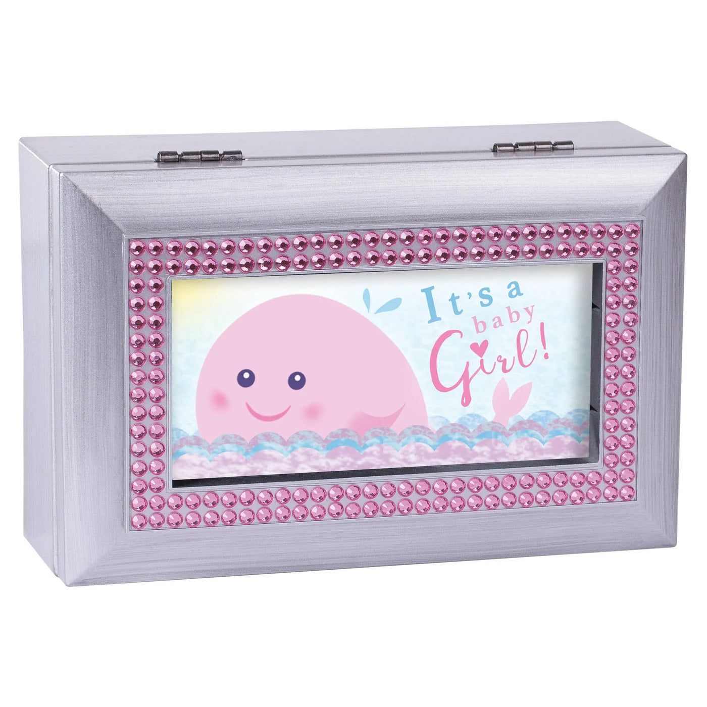 Beveled Petite Music Box With A Silver Finish And Red Beads Mounted On Hinged Lid Measures Approximately 6 X 4 X 2.5 Inches; Holds A 3 X 5 Inch Personal Photo.