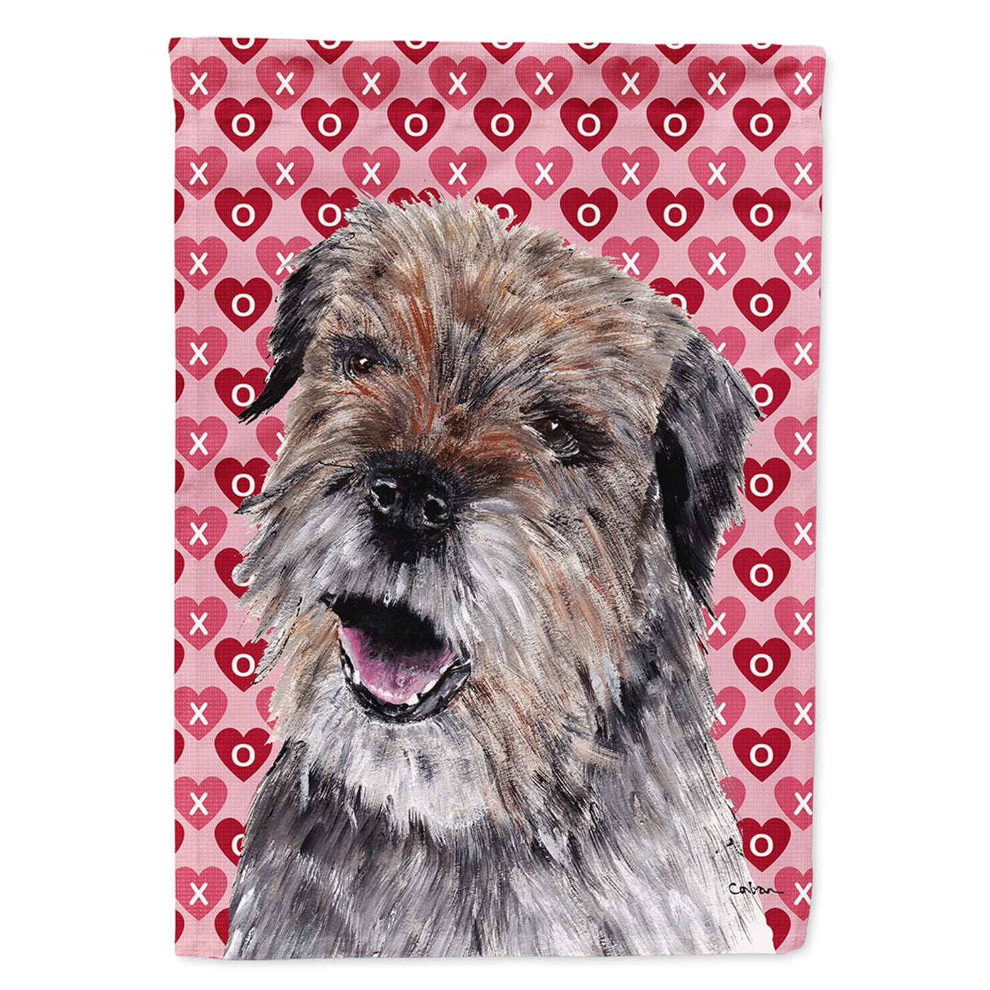 213-615872779802 Border Terrier Hearts And Love Flag Garden Size By Carolines Treasures, Inc, Made In Usa.Artwork For Your Garden, Patio Or Yard. This Is A Thick Double Sided Garden Flag Made From Two Pieces Of Polyester Fabric. This 2 Ply Garden Size Flag Is Water Resistant And Weather Proof. Heavier Than Most Other Garden Flags Available This Flag Will Hold Up In Wind, Rain And Snow. Make Your Personal Statement In Your Outdoor Decor With This Colorful Quality Garden Flag. This Decorative Garden Size Flag Has A Sleeve Sewn Into The Top Of The Flag To Allow You To Showcase Your New Flag On A Standard Size Garden Stand. The Garden Stand Is Sold Seperately.