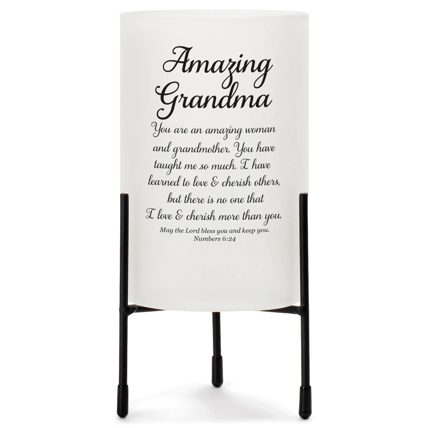 Amazing Grandma - You Are An Amazing Woman And Grandmother. You Have Taught Me So Much. I Have Learned To Love & Cherish Others, But There Is No One That I Love & Cherish More Than You. Includes Numbers 6:24. Hurricane Style Glass Candle Stand Is A Beautiful Way To Illuminate And Convey A Heartfelt Message. White Frosted Glass Is Decorated With A Sentiment On The Outside. Inside Is Room For Your Own Pillar Style Candle (Not Included). Holder Nestles In Its Own Black Metal Stand With Padded Feet To Protect Furniture. Overall Size Of Holder In Stand Is 8 High X 4 Diameter Width.