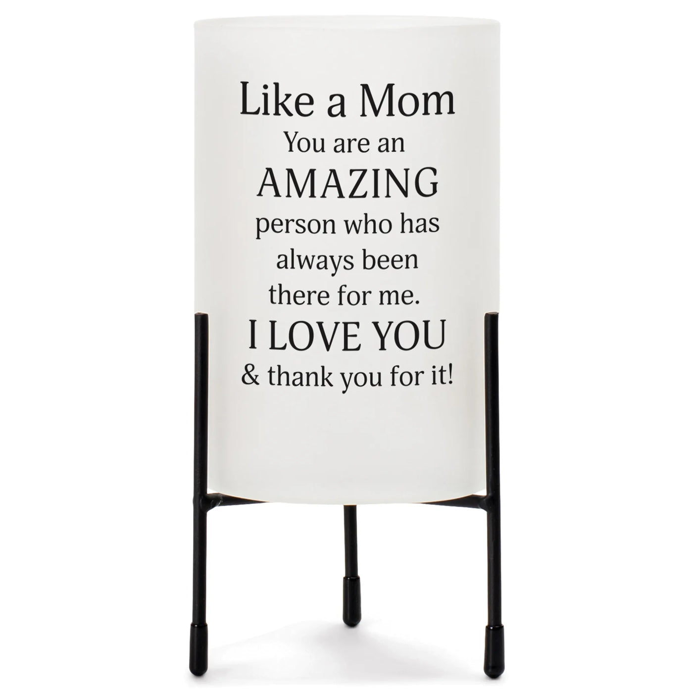 Like A Mom - You Are An Amazing Person Who Has Always Been There For Me. I Love You & Thank You For It! Hurricane Style Glass Candle Stand Is A Beautiful Way To Illuminate And Convey A Heartfelt Message. White Frosted Glass Is Decorated With A Sentiment On The Outside. Inside Is Room For Your Own Pillar Style Candle (Not Included). Holder Nestles In Its Own Black Metal Stand With Padded Feet To Protect Furniture. Overall Size Of Holder In Stand Is 8 High X 4 Diameter Width.