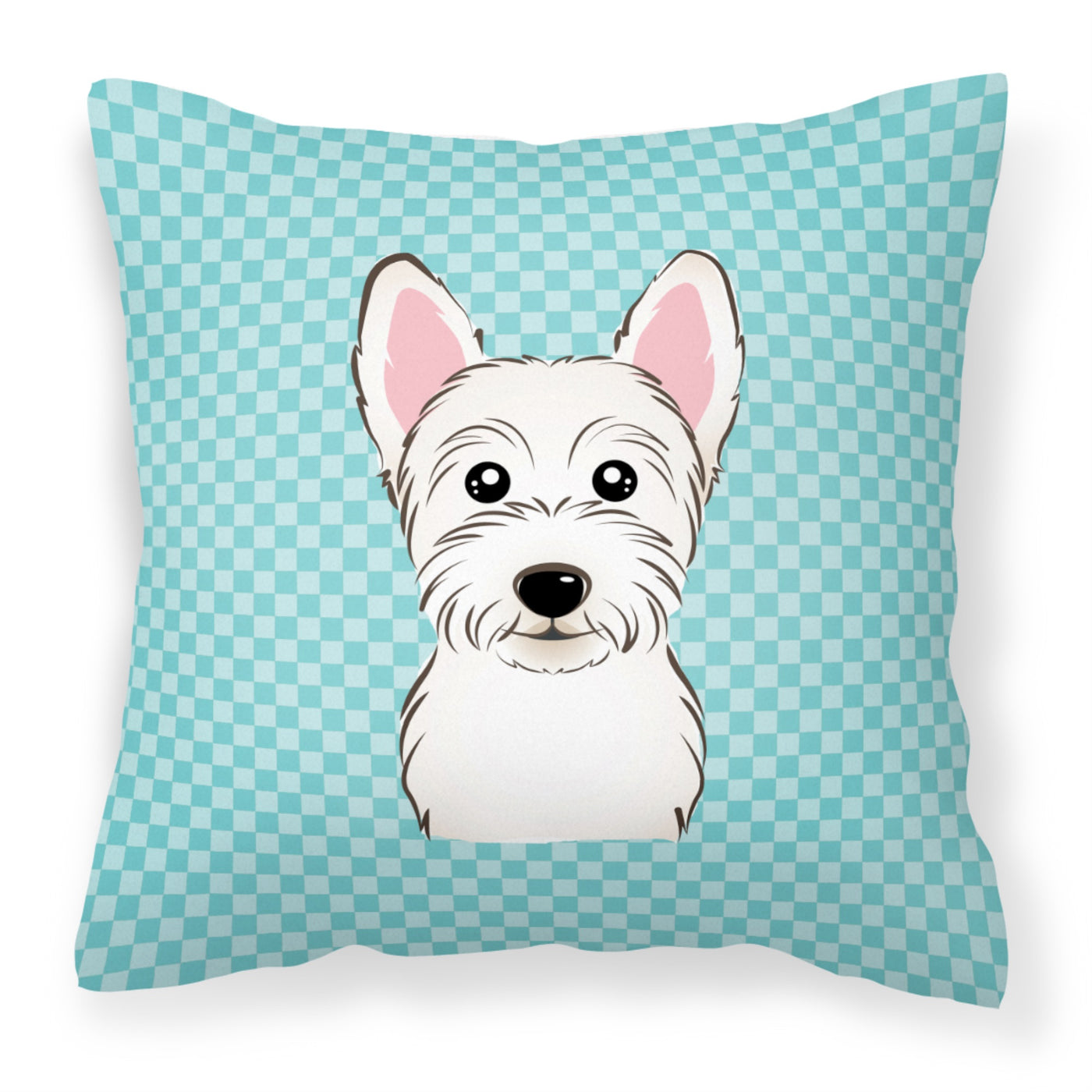 213-615872896295 Checkerboard Blue Westie Fabric Decorative Pillow By Carolines Treasures, Inc, Made In Usa.Add Color To Your Solid Color Outdoor Patio Furniture Or Outdoor Seating Area With Our Full Color Artwork Outdoor Pillows. Approximately 14 Inches By 14 Inches Measured From Corner Of Pillow. 100% Polyester Fabric Pillow Sham With Pillow Form. This Pillow Is Made From Caroline'S Treasures New Material That Is Woven To Be Water Resistant. This Soft Canvas Fabric Can Be Used Inside On The Couch Or Outside On The Patio, Porch Or Veranda. We Dye The Fabric With Dyes That Are Color Fast And Built To Handle Weather. The Fabric Is Also Mildew Resistant, Stain Resistant, Fade Resistant And Machine Washable. Three Pieces Of Fabric Are Sewn Together To Create A Sham And Then A Polyester Insert Is Placed Inside The Sham To Form The Pillow. The Pillow Is Overstuffed And Holds It'S Shape. Both The Sham And The Pillow Insert Are Made In The United States. The Pillows Are All Handmade And May Vary Slightly In Size.