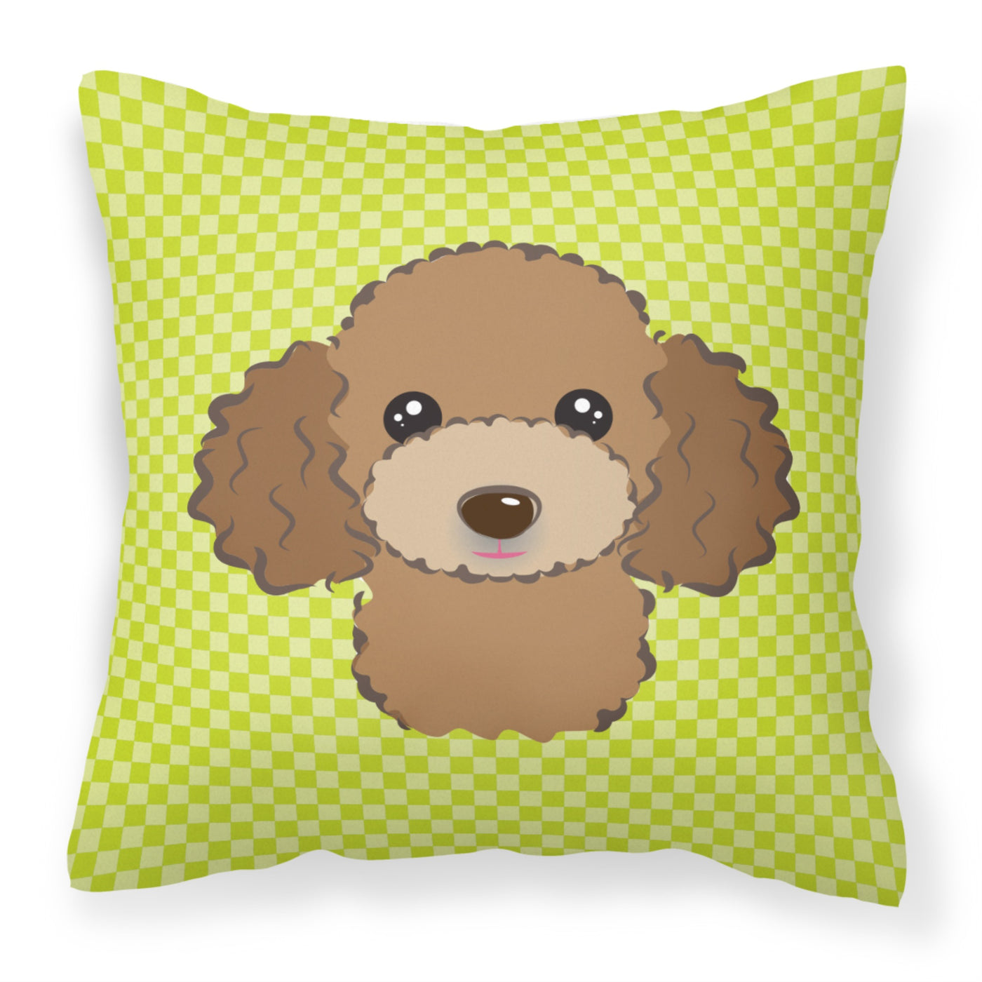 213-615872897834 Checkerboard Lime Green Chocolate Brown Poodle Fabric Decorative Pillow By Carolines Treasures, Inc, Made In Usa.Add Color To Your Solid Color Outdoor Patio Furniture Or Outdoor Seating Area With Our Full Color Artwork Outdoor Pillows. Approximately 14 Inches By 14 Inches Measured From Corner Of Pillow. 100% Polyester Fabric Pillow Sham With Pillow Form. This Pillow Is Made From Caroline'S Treasures New Material That Is Woven To Be Water Resistant. This Soft Canvas Fabric Can Be Used Inside On The Couch Or Outside On The Patio, Porch Or Veranda. We Dye The Fabric With Dyes That Are Color Fast And Built To Handle Weather. The Fabric Is Also Mildew Resistant, Stain Resistant, Fade Resistant And Machine Washable. Three Pieces Of Fabric Are Sewn Together To Create A Sham And Then A Polyester Insert Is Placed Inside The Sham To Form The Pillow. The Pillow Is Overstuffed And Holds It'S Shape. Both The Sham And The Pillow Insert Are Made In The United States. The Pillows Are All Handmade And May Vary Slightly In Size.