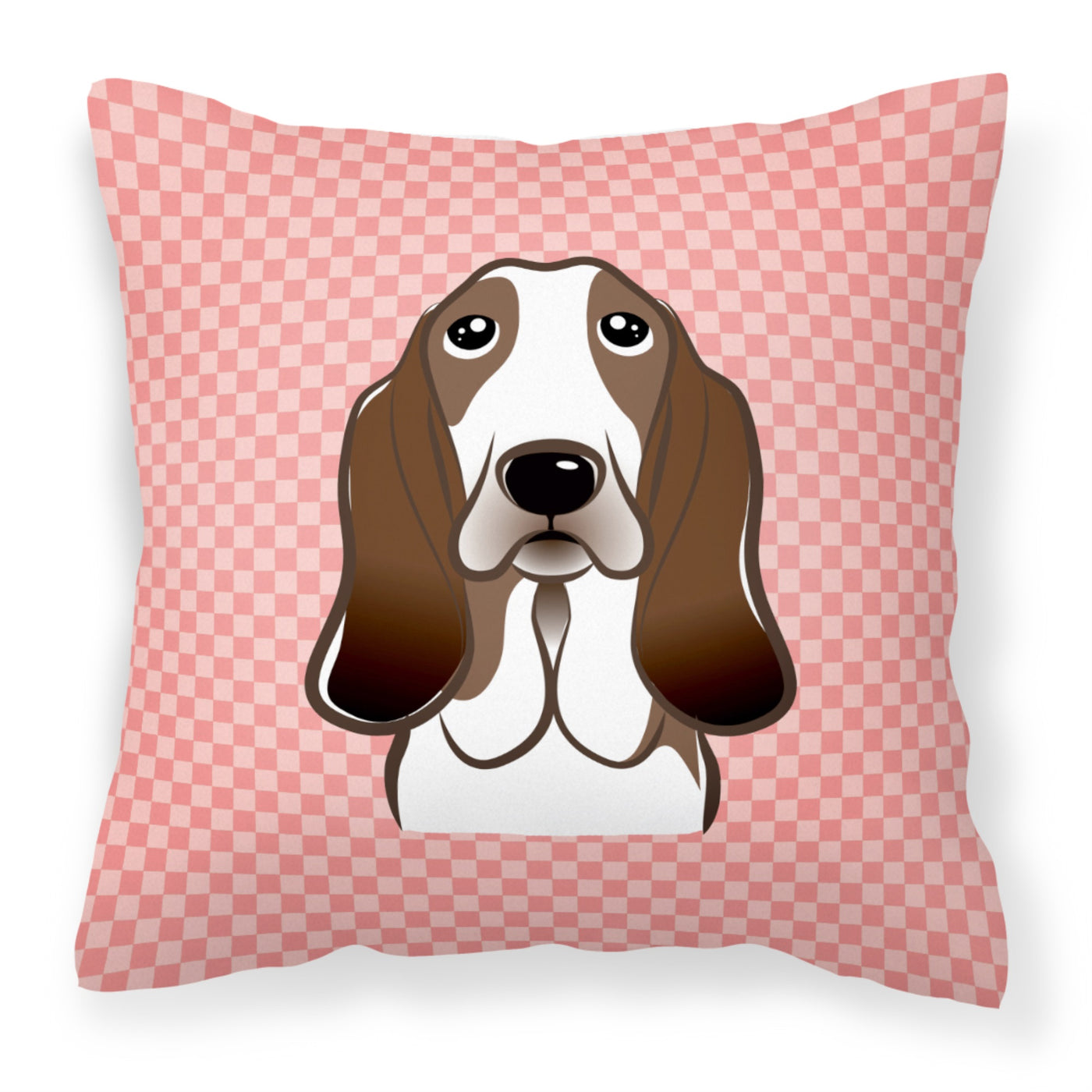 213-615872897087 Checkerboard Pink Basset Hound Fabric Decorative Pillow By Carolines Treasures, Inc, Made In Usa.Add Color To Your Solid Color Outdoor Patio Furniture Or Outdoor Seating Area With Our Full Color Artwork Outdoor Pillows. Approximately 14 Inches By 14 Inches Measured From Corner Of Pillow. 100% Polyester Fabric Pillow Sham With Pillow Form. This Pillow Is Made From Caroline'S Treasures New Material That Is Woven To Be Water Resistant. This Soft Canvas Fabric Can Be Used Inside On The Couch Or Outside On The Patio, Porch Or Veranda. We Dye The Fabric With Dyes That Are Color Fast And Built To Handle Weather. The Fabric Is Also Mildew Resistant, Stain Resistant, Fade Resistant And Machine Washable. Three Pieces Of Fabric Are Sewn Together To Create A Sham And Then A Polyester Insert Is Placed Inside The Sham To Form The Pillow. The Pillow Is Overstuffed And Holds It'S Shape. Both The Sham And The Pillow Insert Are Made In The United States. The Pillows Are All Handmade And May Vary Slightly In Size.