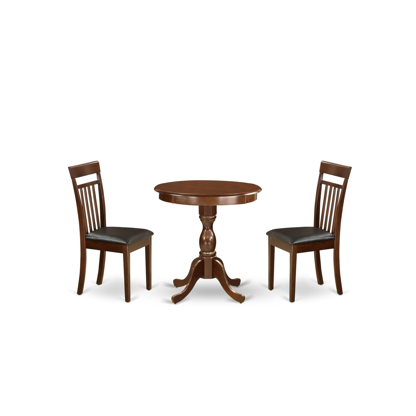 Esca3-Mah-Lc East West Furniture - Esca3-Mah-Lc - 3-Pc Kitchen Dining Set - 1 Kitchen Dining Table And 2 Dining Room Chairs (Mahogany Finish), East West Furniture - Esca3-Mah-Lc - 3-Pc Kitchen Dining Room Setthis Dining Room Table Set Includes 2 Dining Room Chairs And 1 Modern Round Dining Table. This Modern Round Dining Table Has A Round Table Top And Beautiful Legs. The Solid Wood Frame And Back Ensure That These Wood Chairs Sturdiness And Offers Decent Support To Your Back, In Addition To Their Ideal Size These Urban Style Chairs Are Trouble Free To Assemble And Easy To Rearrange. These Simple But Charming Wooden Dining Room Chairs Will Add Ambiance And Style To Your Dining Room. Give Your Home A Pop Of Chic Style With This Must Have Dining Room Set. A Contemporary Twist On A Classic Design, This Eye-Catching Modern Dining Set Design Will Liven Up Any Timeless Appeal. Just By Switching Out Your Modern Wood Chairs And Dining Table, You Can Effortlessly Refresh Your Dining Space. This Kitchen Table Set Is Very Easy To Assemble. You Only Need Around 30 Minutes To Build This Dinette Set. This Dinette Room Set Comes With All The Necessary Hardware To Assemble This Kitchen Dining Room Set. These Dining Chairs Are Easy To Carry Or Move Around. Enjoy With East West Furniture!Features:Material: Woodseat Material: Faux Leatherdining Room Chairs Color: Mahoganywood Dining Table Color: Mahoganybreakfast Table Dimensions Are: Length 30; Width 30; Height 36.Wooden Dining Room Chairs Dimensions Are: Length 17; Width 20; Height 39.Included In The Package: 1 Beautiful Kitchen Dining Table And 2 Marvelous Mid Century Wooden Chairs.