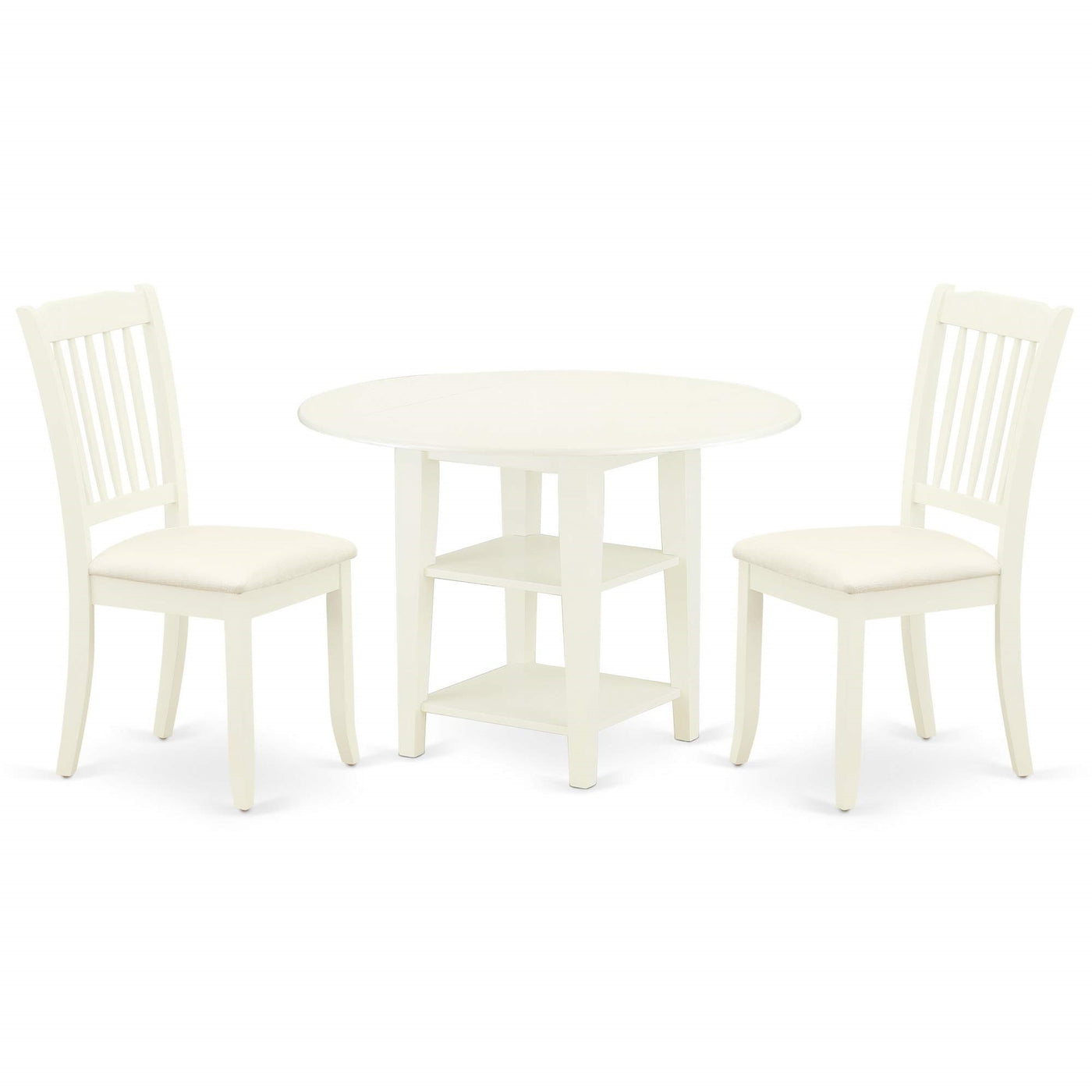 East West Furniture Suda3-Lwh-C 3 Piece Dining Table Set Contains A Round Dining Room Table With Dropleaf & Shelves And 2 Linen Fabric Upholstered Chairs, 42X42 Inch, Linen White