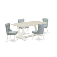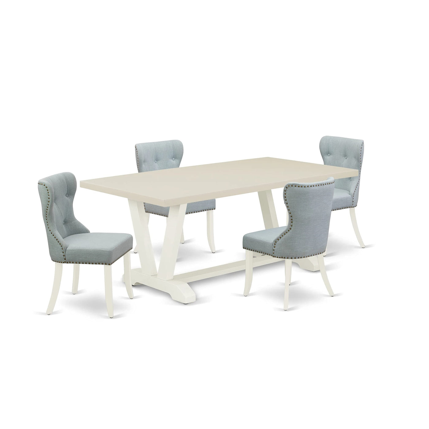 East West Furniture V027Si215-5 V-Style 5 Piece Dining Set For 4 Includes A Rectangle Kitchen Table With V-Legs And 4 Baby Blue Linen Fabric Upholstered Chairs, 40X72 Inch
