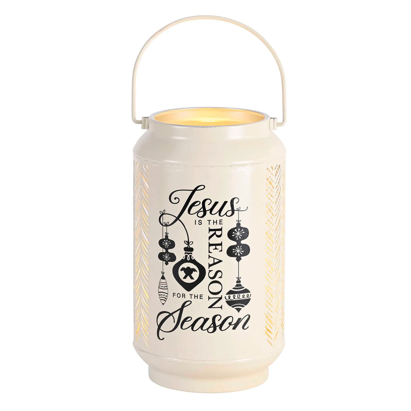 This Distressed Ivory Lantern Shines Brightly With A Heartfelt Sentiment. The Inside Is Coated With A Metallic Silver. E27 Edison Led 25 Watt Lightbulb Included, Needs 3 Aaa Batteries (Not Included). Size 5X5X8.7. Sentiment Reads: Jesus Is The Reason For The Season.