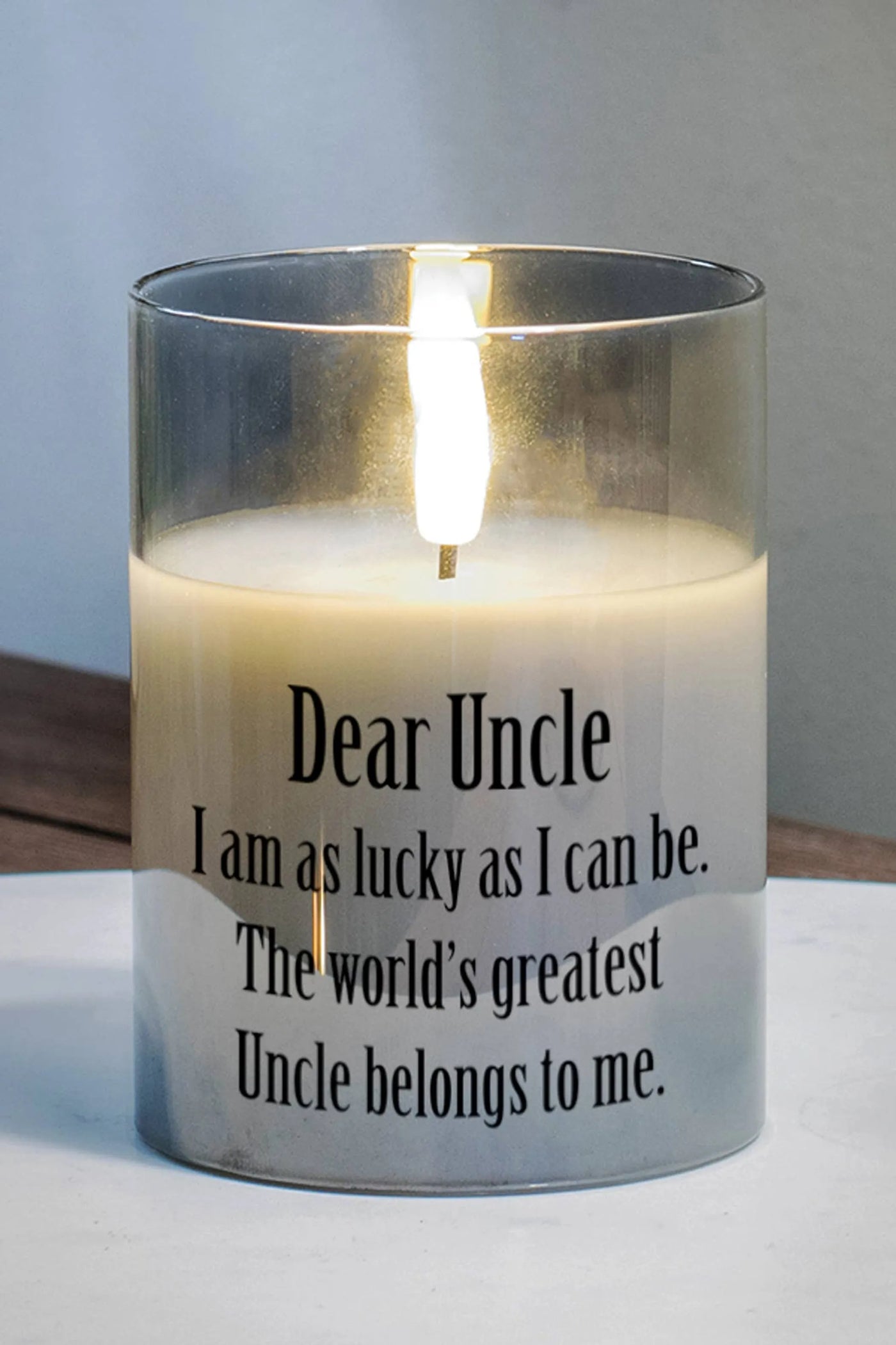 Flameless Pearlized Grey Led Glass Candle That Says: Dear Uncle/I Am As Lucky As I Can Be.