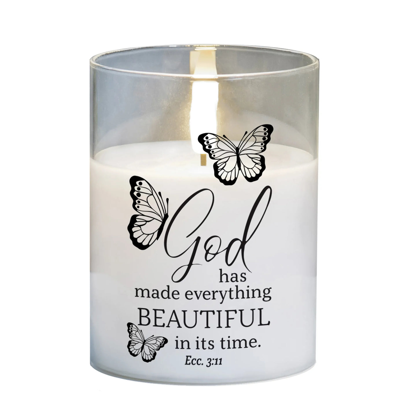 Flameless Clear Led Glass Candle That Features Ecclesiastes 3:11: God Has Made Everything Beautiful In Its Time. 4In Tall Led Candle Has A Flickering Flame Appearance; 3In Diameter. Takes Three Aaa Batteries, Not Included.