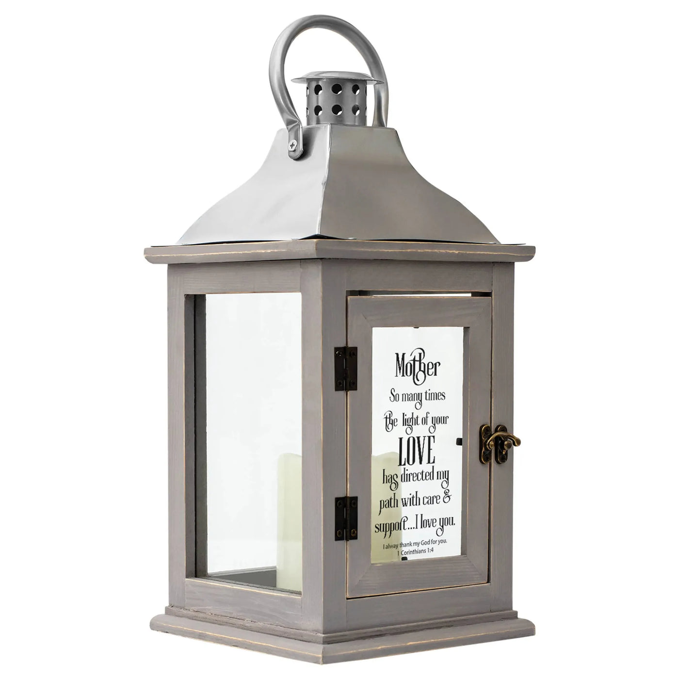 1 Corinthians 1:4.' Elegant Wood Lantern Is Dove Gray, With Rustic Distressed Edges.