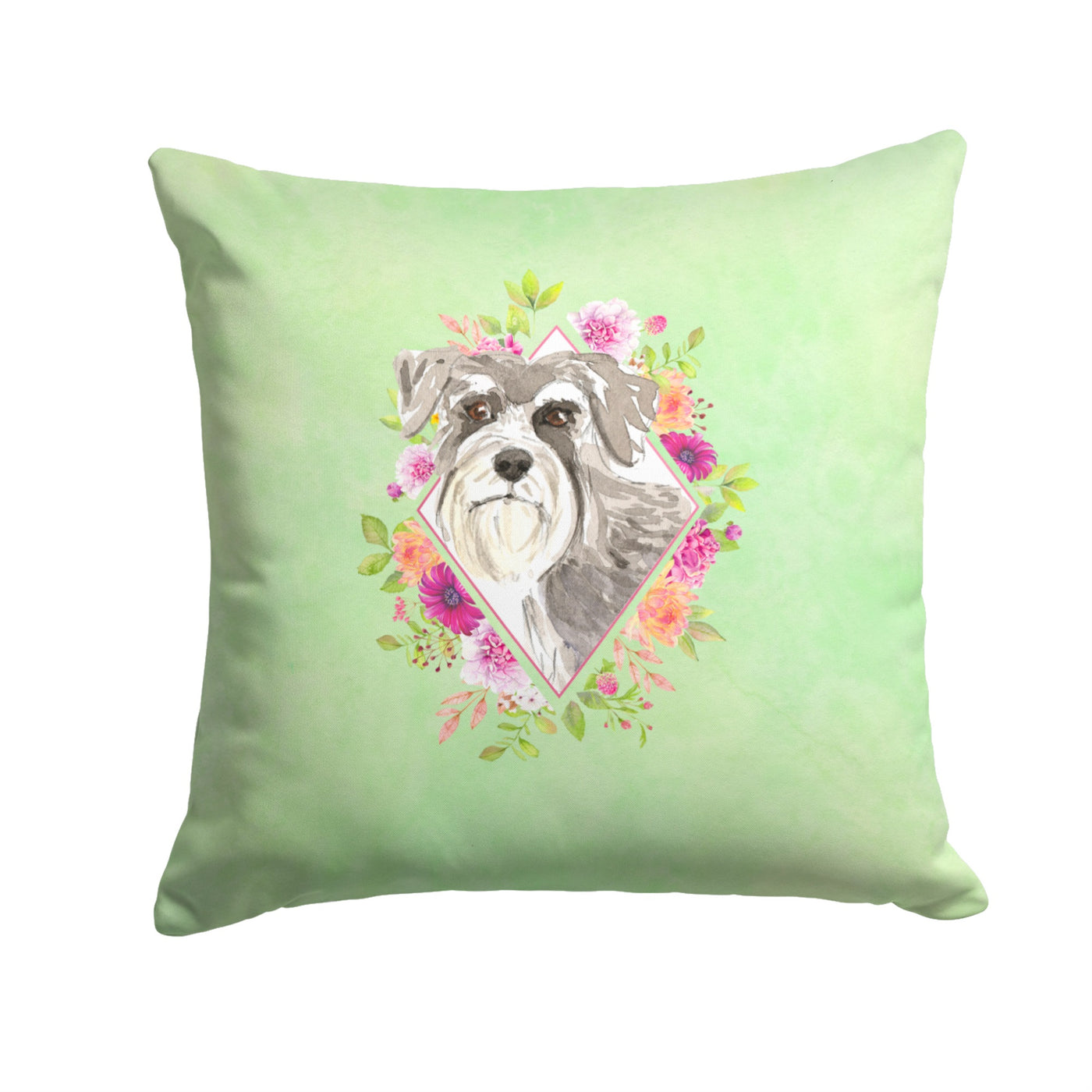 213-194030083369 Schnauzer #1 Green Flowers Fabric Decorative Pillow By Carolines Treasures, Inc, Made In Usa.Add Color To Your Solid Color Outdoor Patio Furniture Or Outdoor Seating Area With Our Full Color Artwork Outdoor Pillows. Approximately 14 Inches By 14 Inches Measured From Corner Of Pillow. 100% Polyester Fabric Pillow Sham With Pillow Form. This Pillow Is Made From Caroline'S Treasures New Material That Is Woven To Be Water Resistant. This Soft Canvas Fabric Can Be Used Inside On The Couch Or Outside On The Patio, Porch Or Veranda. We Dye The Fabric With Dyes That Are Color Fast And Built To Handle Weather. The Fabric Is Also Mildew Resistant, Stain Resistant, Fade Resistant And Machine Washable. Three Pieces Of Fabric Are Sewn Together To Create A Sham And Then A Polyester Insert Is Placed Inside The Sham To Form The Pillow. The Pillow Is Overstuffed And Holds It'S Shape. Both The Sham And The Pillow Insert Are Made In The United States. The Pillows Are All Handmade And May Vary Slightly In Size.
