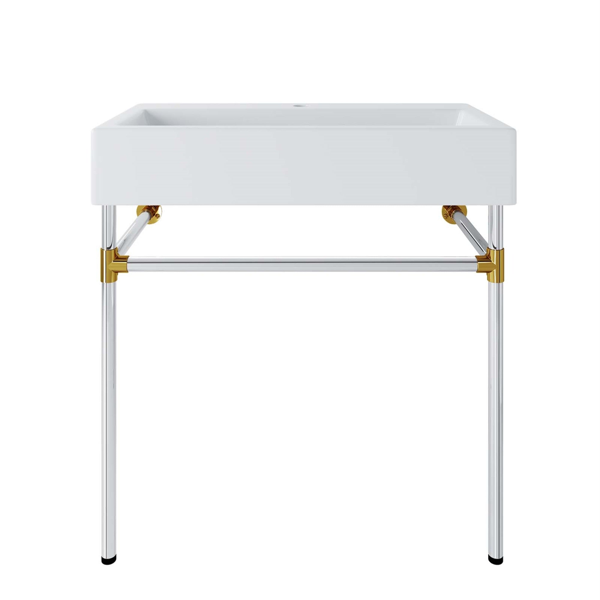 Transform Your Bathroom Into A Serene Oasis With The Redeem Wall-Mount Silver Stainless Steel Bathroom Vanity. This Minimalist Vanity Combines Style And Efficiency, Featuring A Glossy White Ceramic Basin And A Sturdy Stainless Steel Frame That Securely Attaches To Your Bathroom Or Powder Room Wall. The Silver Stainless Steel Frame With Gold Joints Adds A Touch Of Elegance And Stability. With A Single Faucet Hole And Non-Marking Foot Caps To Protect Your Floor, This Vanity Is Both Functional And Stylish. Please Note That Assembly Is Required And Fixtures Are Not Included. The Set Includes One Redeem 32' Silver Stainless Steel Wall-Mount Bathroom Vanity.