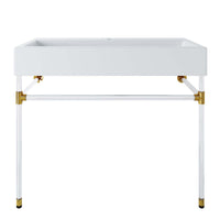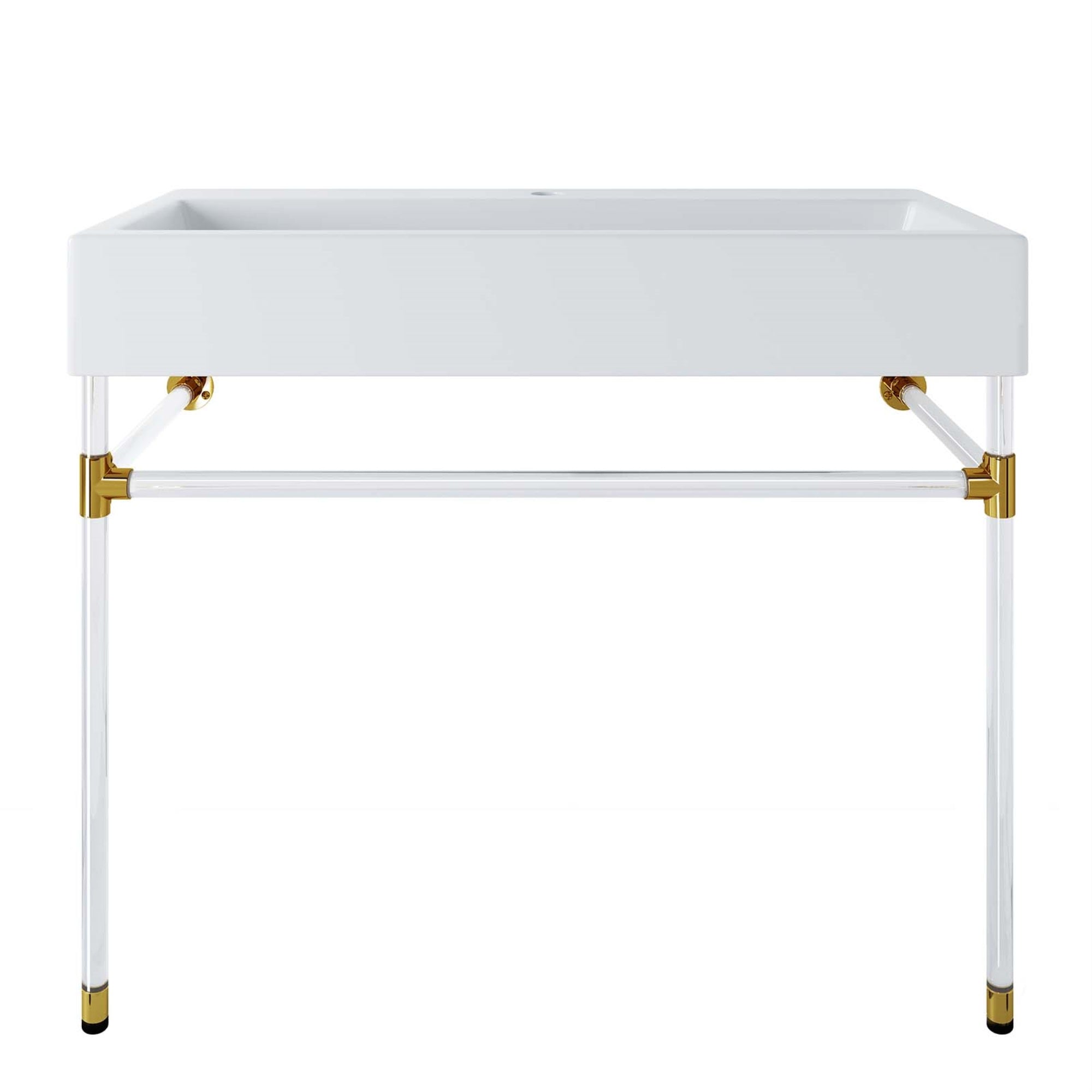 Transform Your Bathroom Into A Serene Retreat With The Sleek And Functional Redeem Wall-Mount Silver Stainless Steel Bathroom Vanity. Its Minimalist Design Features A Glossy White Ceramic Basin And A Streamlined Acrylic Frame That Securely Attaches To Your Bathroom Or Powder Room Wall. The Vanity Exudes Sophistication, With Its Sturdy Acrylic Frame And Gold Joints For Extra Stability. It Comes With A Single Faucet Hole And Non-Marking Foot Caps To Safeguard Your Bathroom Floor. Please Note That Assembly Is Required And Fixtures Are Not Included. The Set Includes One Redeem 40' Acrylic Wall-Mount Bathroom Vanity.