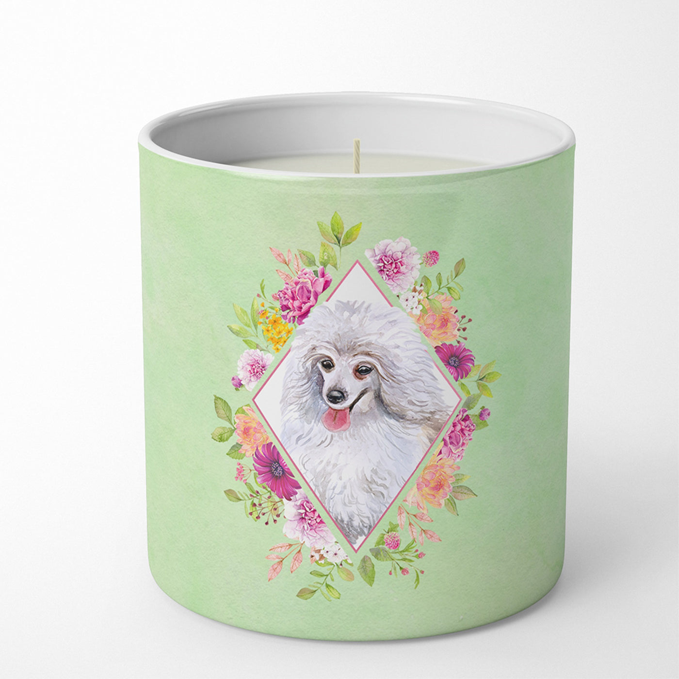 White Mini Poodle Green Flowers 10 Oz Decorative Soy Candle