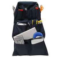 This 14-Pocket Seat-Back Organizer In Blue Fits Over The Back Of Your Headrest And Features Pockets To Hold Maps Tools Gloves And More. It Is Water And Soil Resistant And Has A Vinyl Backing. The Double Stitched Seams Provide Long Lasting Durability. Size: 29 .In H X 18 .In W.
