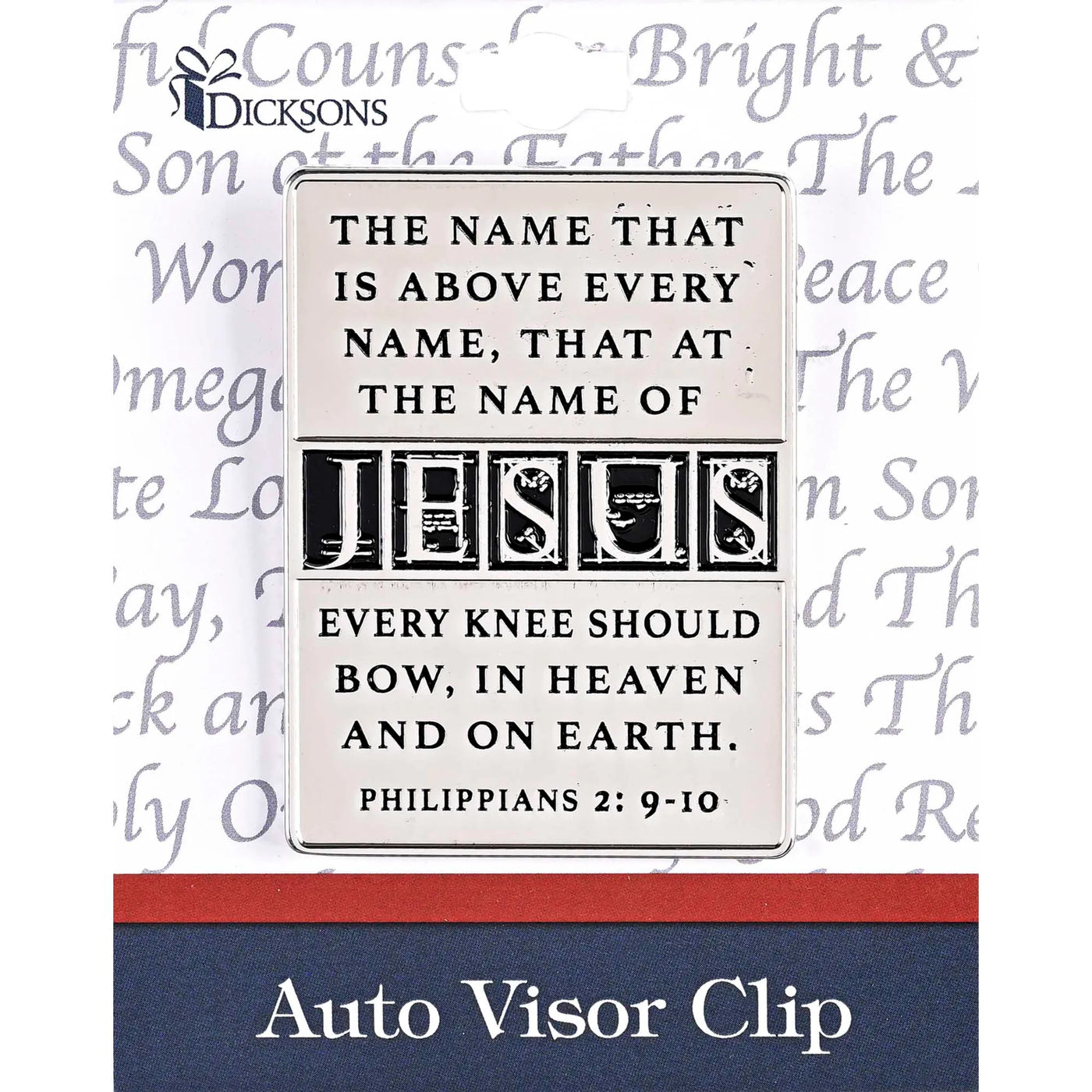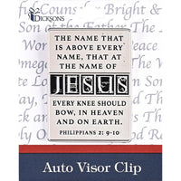 Visor Clip Made Of Zinc Alloy Metal With Antique Silver Finish; Size Is 2 1/4 Diameter. Features Names Of Jesus And Reads: The Name That Is Above Every Name, That At The Name Of Jesus Every Knee Should Bow, In Heaven And On Earth. Philippians 2:9-10. Has Clip On Back That Easily Attaches To Auto Visor. Comes On A D?Corative Backer Card.