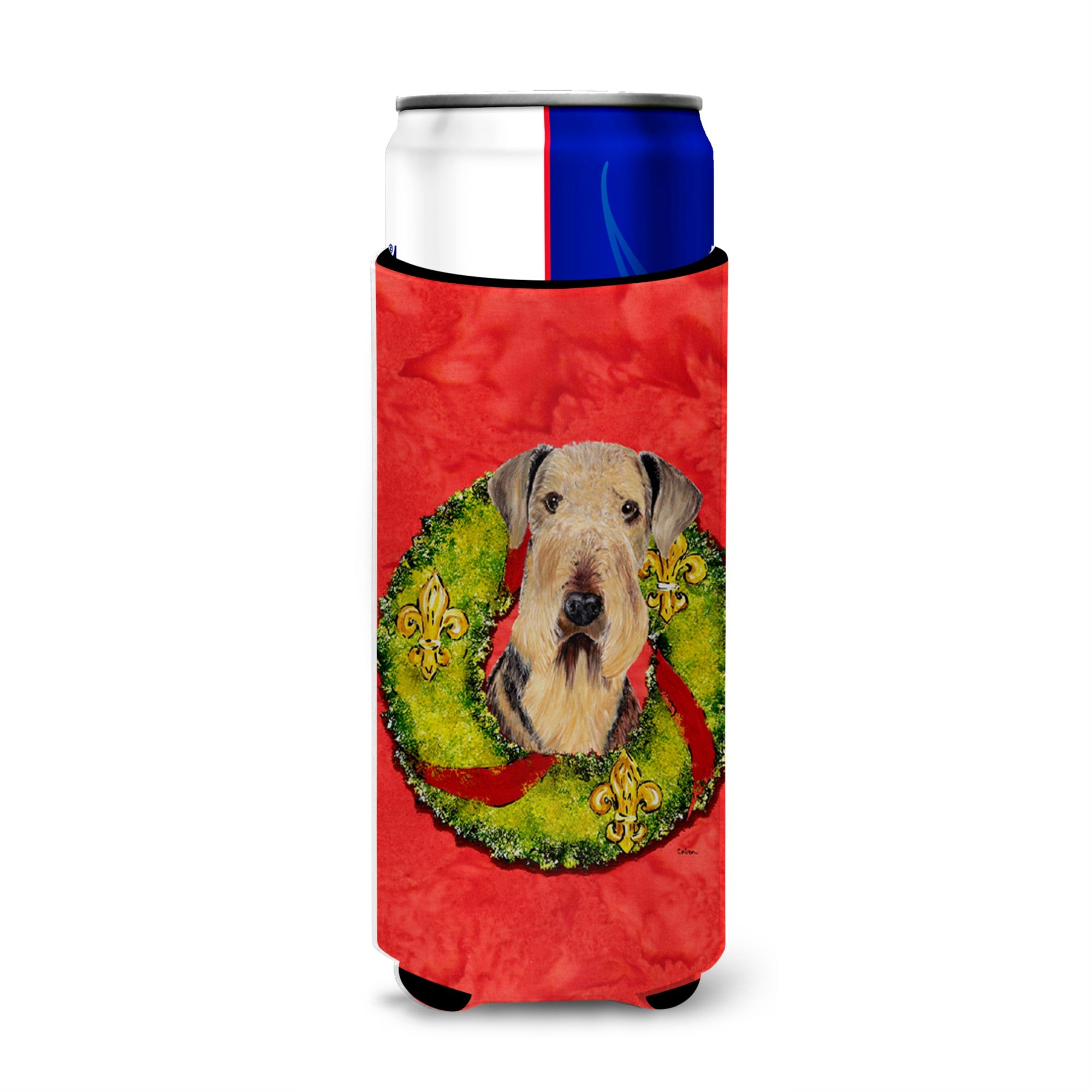 213-615872737291 Airedale Christmas Wreath Ultra Hugger For Slim Cans By Carolines Treasures, Inc, Made In Usa.Whatever You Drink We Have You Covereed. Artwork Created By One Of Our Artists And Printed In Full Color On This Bottle Cover. This Full Color Artwork Hugger Fits12 Oz Slim Cans For Michelob Ultra, Starbucks Refreshers, Heineken Light, Bud Lite Lime 12 Oz, Dry Soda, Coors, Resin, Vitaminwater Engergy, And Perrier Cans. Great Collapsible Beverge Insulator. Great To Keep Track Of Your Beverage And Add A Bit Of Flair To A Gathering. These Are In Full Color Artwork And Washable In The Washing Machine. Design Will Not Come Off.