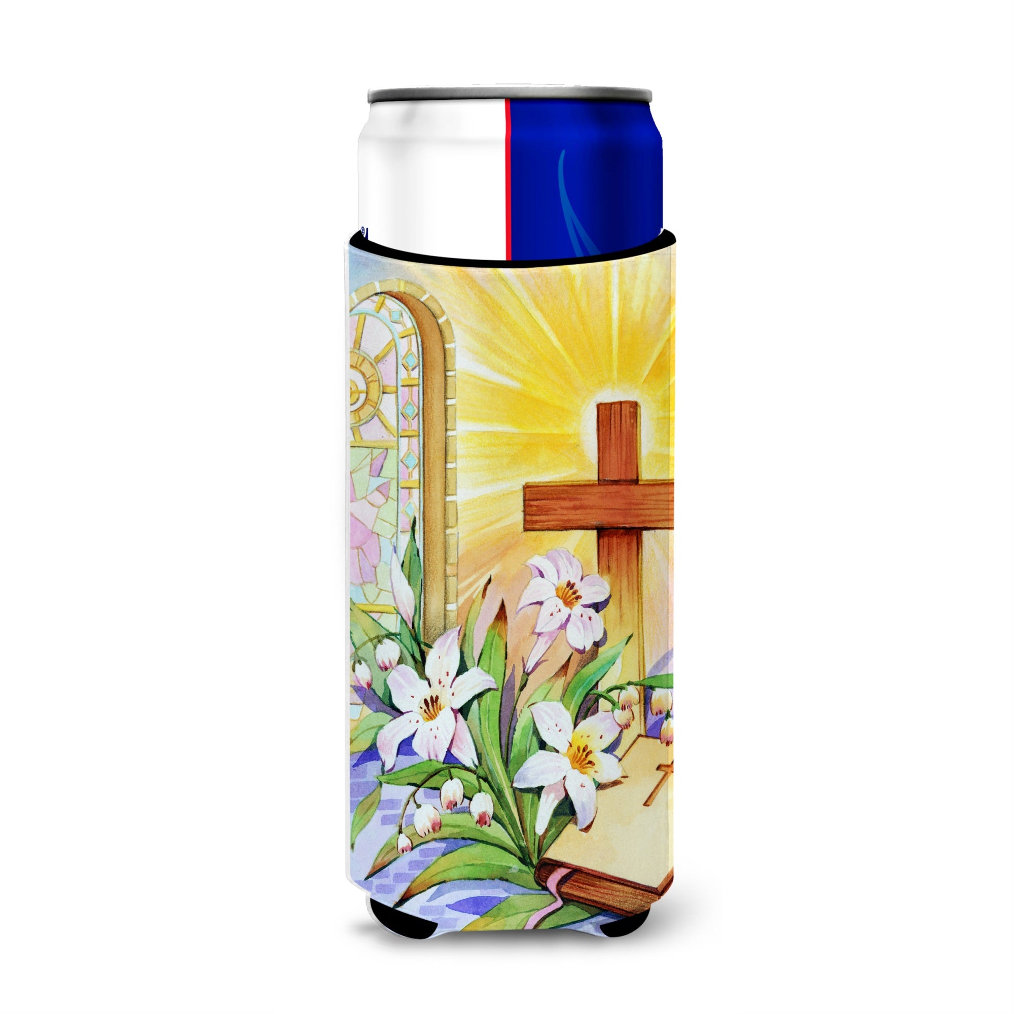 Caroline'S Treasures Easter Cross And Bible In Stain Glass Window Michelob Ultra Koozies For Slim Cans, Multicolor
